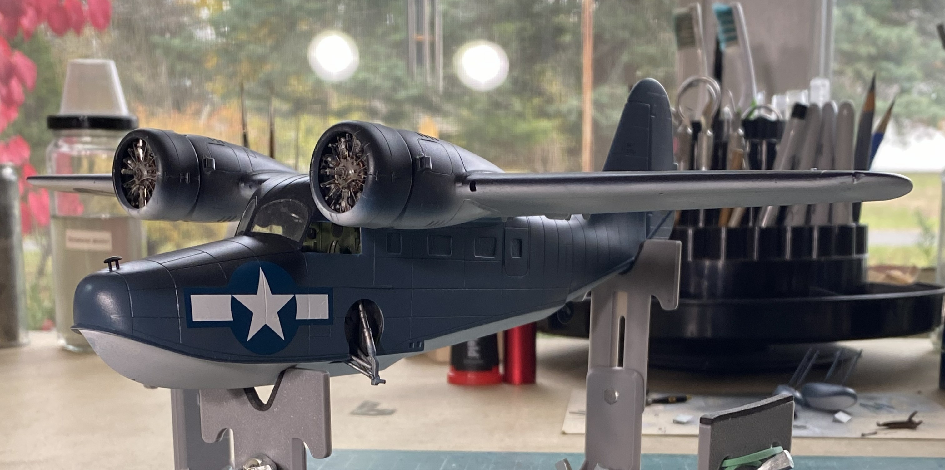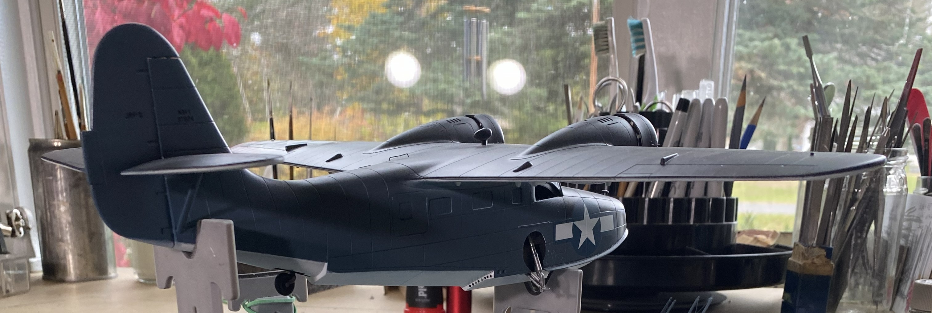 Increasingly, flat finishes on WWII aircraft are looking wrong to my eye. This time, I decided I’d do a semi-gloss (Tamiya X-35 Semi Gloss Clear) instead. This is where painting order becomes important. I have three basic areas to paint (not counting all the smaller details that haven’t been added yet, such as the floats in the photo below), top, bottom, and sides. I held the build by the sides and shot the top with semi-gloss. Once that set overnight, I did the bottom the same way. Doing it in this order meant that I’d have the wings to hold and manipulate the model during painting. The last thing to paint was the sides because now I can hold it by the wings: