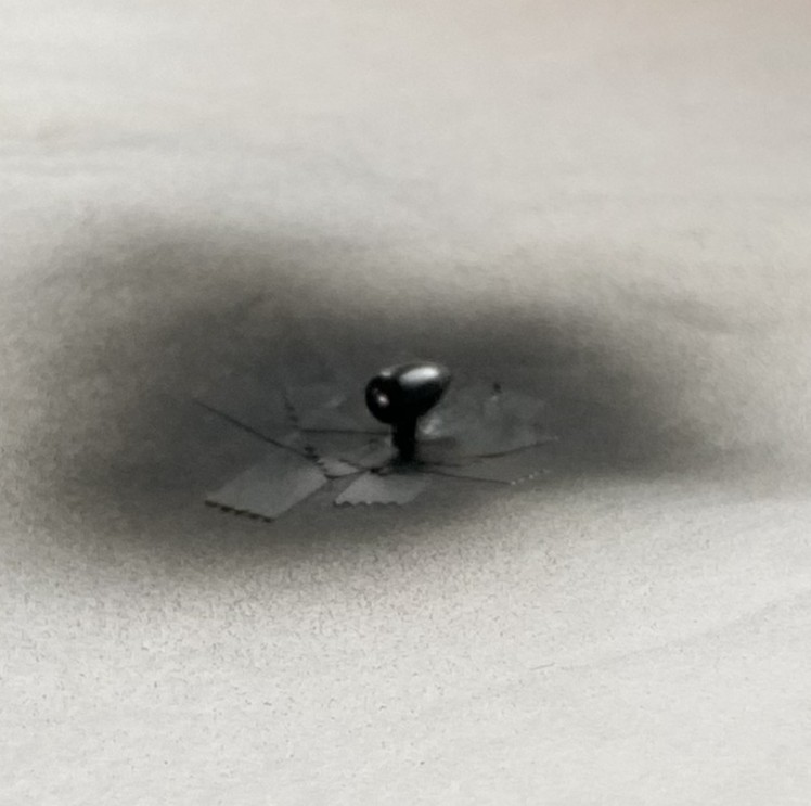 As I’ve been putting this together, obviously the more parts I add the less places I can hold it. For that reason (because these things get handled and transported) I wanted the aerials to be semi-removable; permanently attached at the wing tips, removable at the vertical stabilizer. What would make doing that simple would be to make the attachment point on the vertical stabilizer detachable. Or…I could mount the attachment point permanently and have it be J-shaped so that I can just lift the EZ-Line and let it drop. I like that idea, the major flaw is that even though the EZ-Line’s tension is adjustable, that J-hook has to be small. I didn’t have confidence in copper to hold up over the years. Instead I used the E-string from a guitar (thereby creating the moderately rare 5-string variant). Everything about its dimensions are printed on the pouch: