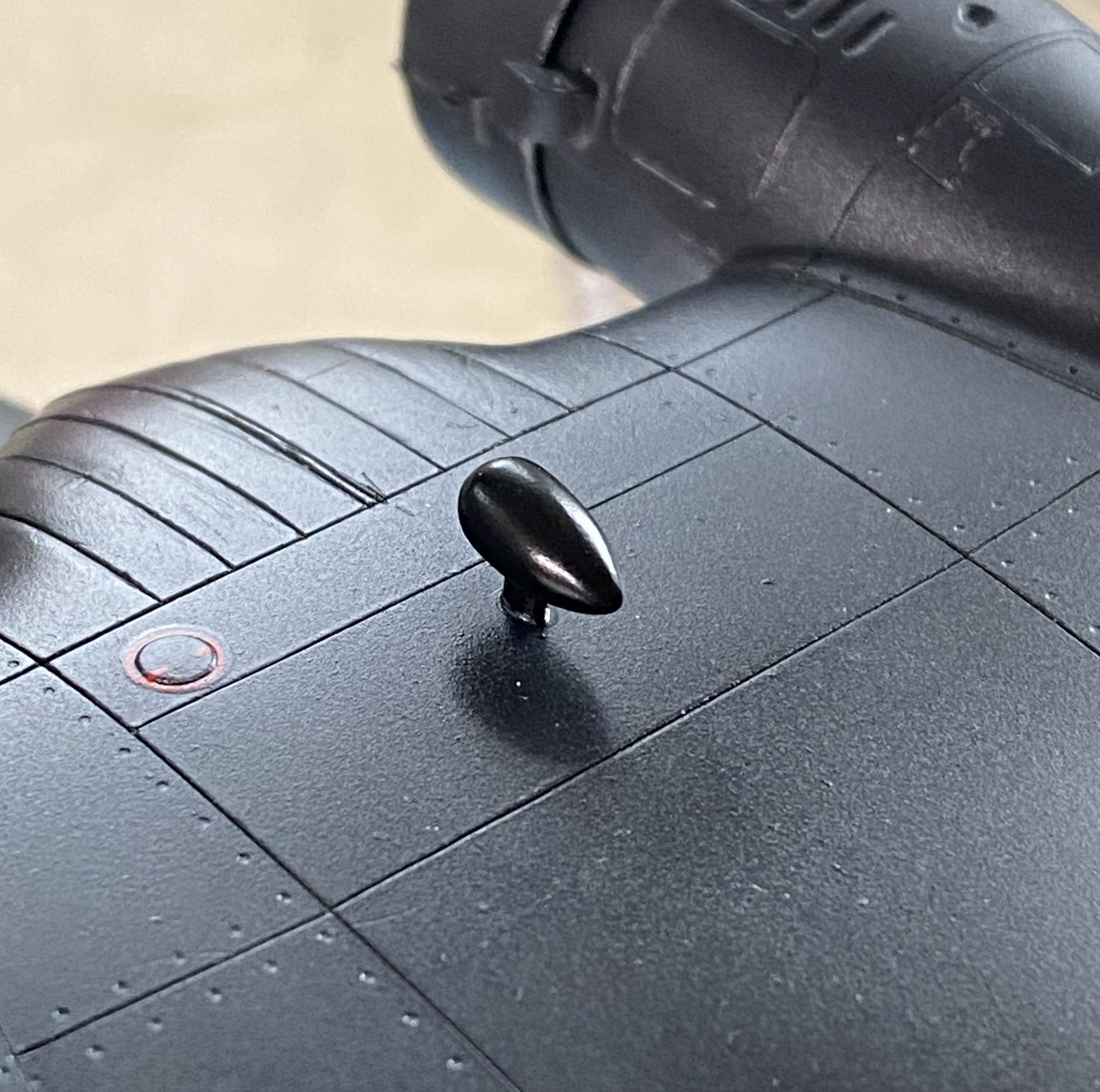 After gluing the other side in place, I tested the arrangement to see if it would function as desired. It function exactly as desired. Top photo below is with the aerials in place, the bottom photo is with the antennas dismounted (for these photos, I dry-fit all the parts yet to add and realized that none of those dry-fit parts need to be glued so I left them on):