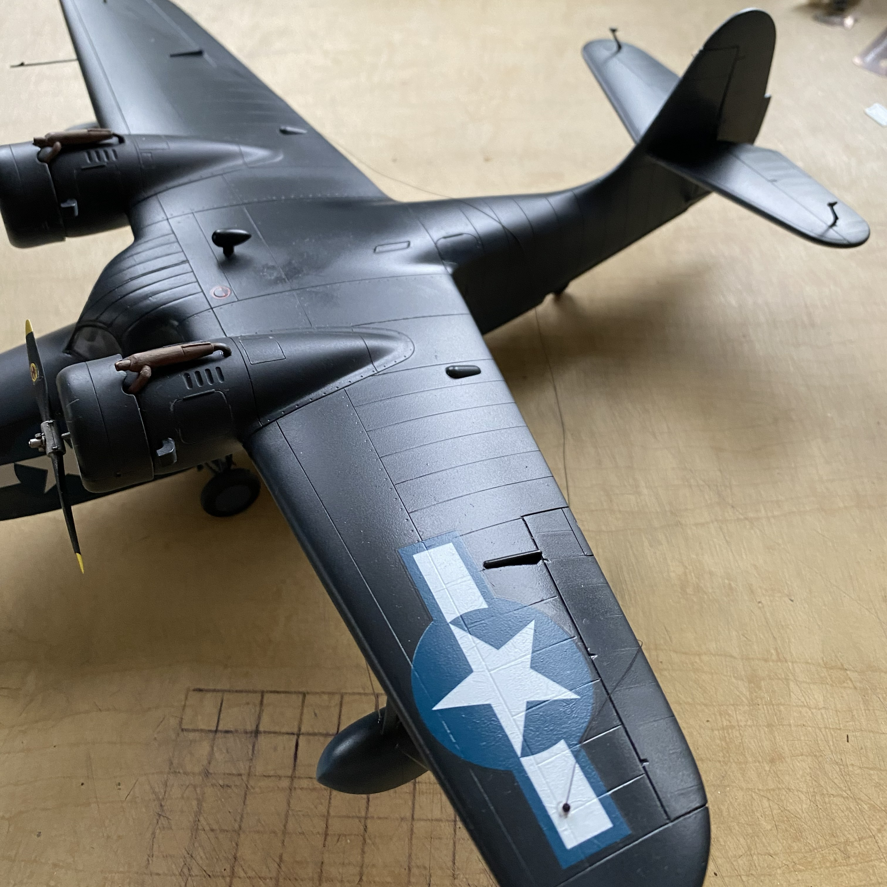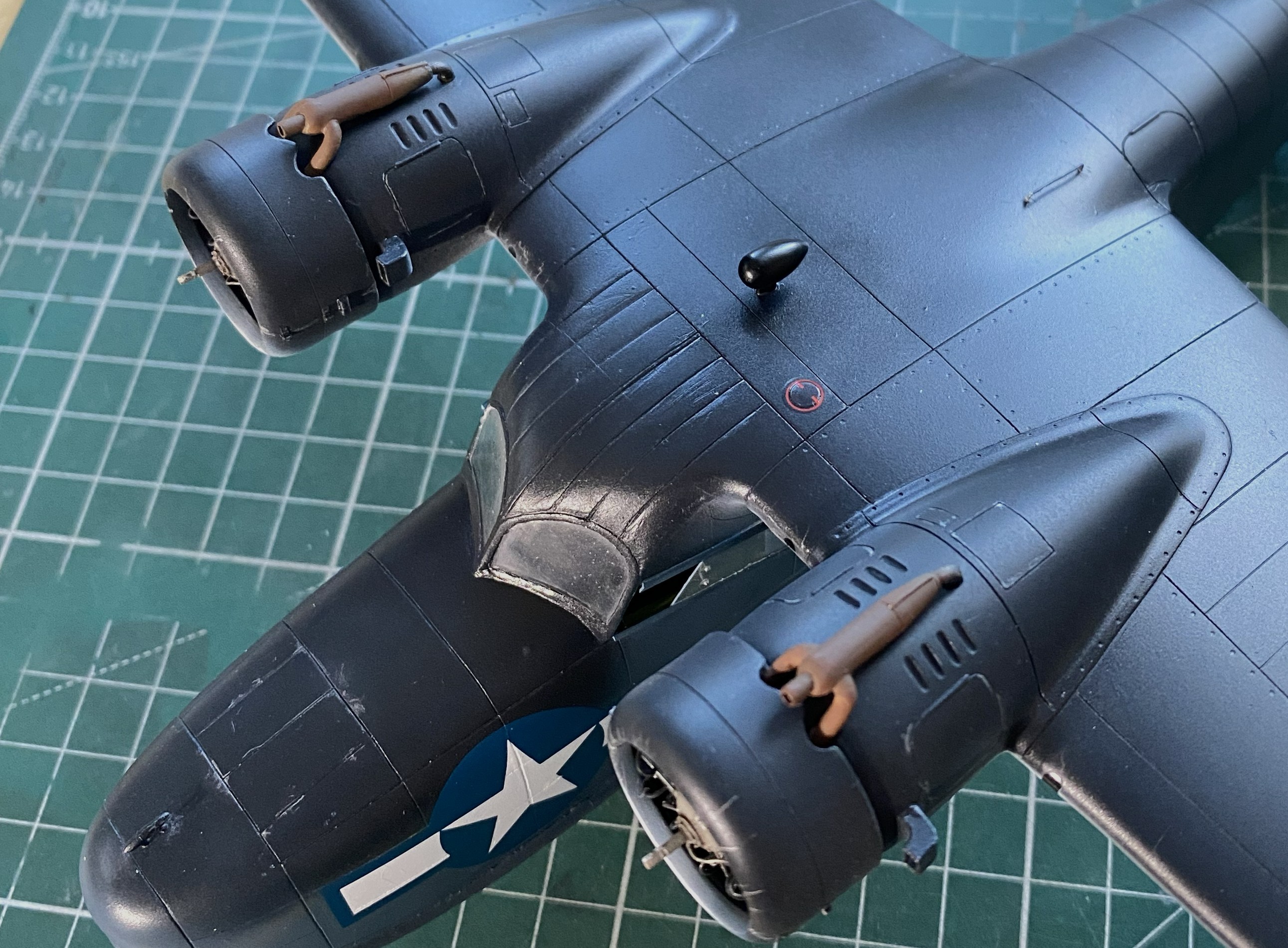 I added the heat exchangers (the brown things over the engine nacelles). Later on I’ll spiff them up a little bit with some pastels: