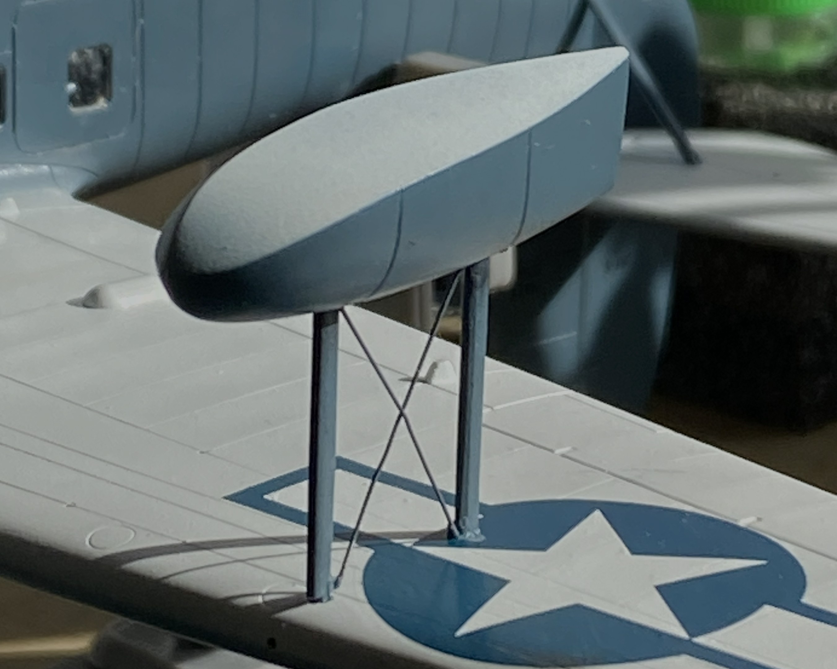 Getting the guy wires into the pre-drilled holes of both the float and wing took some fiddling. For the next float, I tried inserting one end of the guy wires into the float without cement to see if that would be easier: