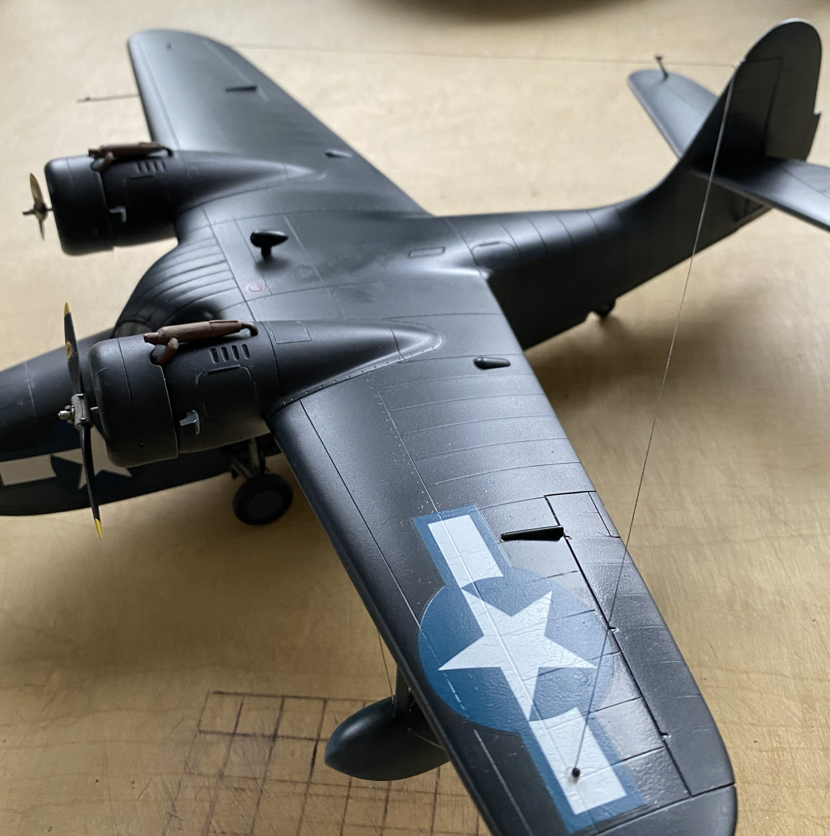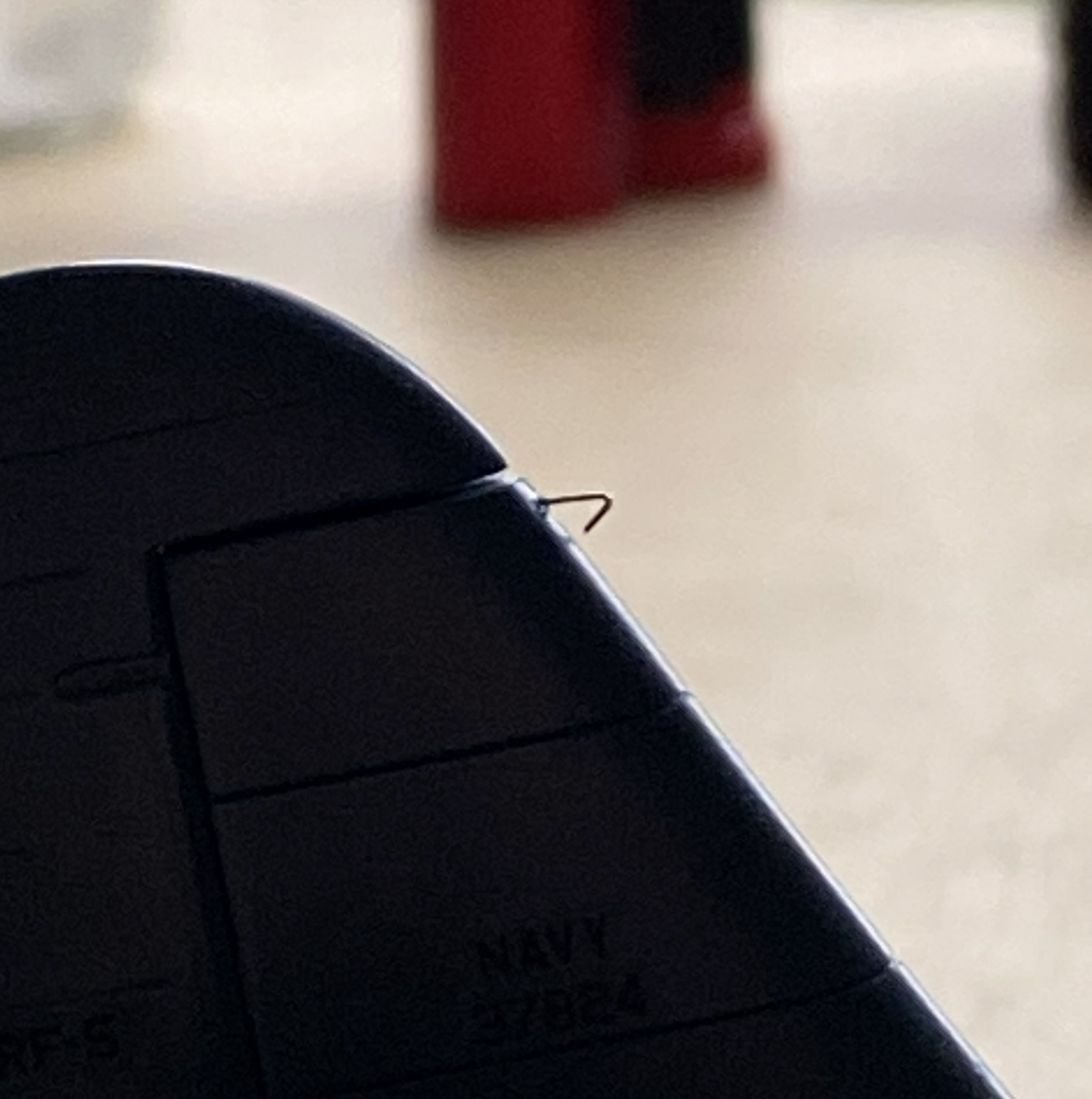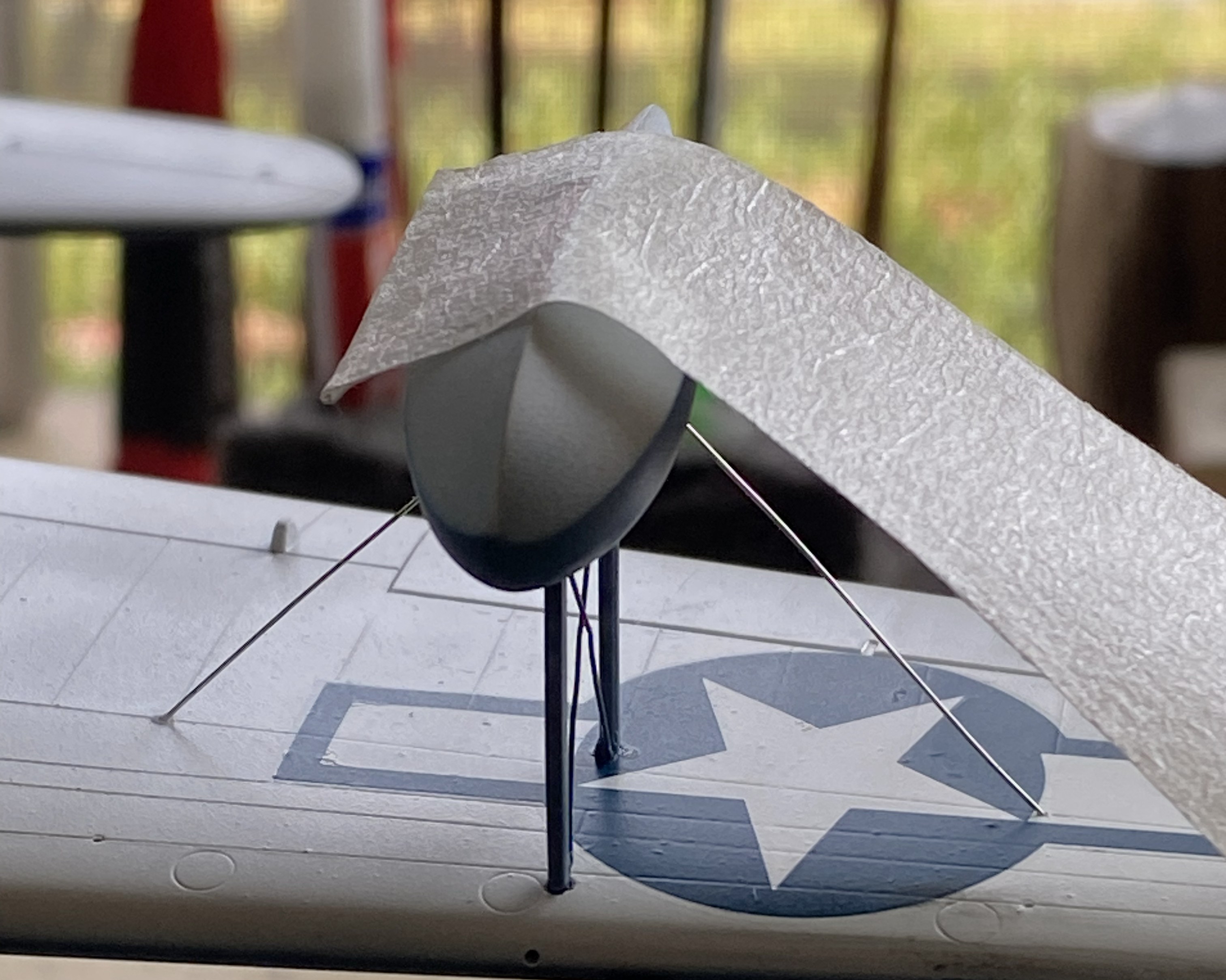 This didn’t work as well as I’d hoped.I was surprised at how difficult it was to just remove the tape. I had to diddle the tape so much that the float came free (in its defense, it hadn’t sat overnight for the plastic to harden fully at the glued points). After I reattached the float to the wing, when I turned the whole thing up side down, all the wires fell out: