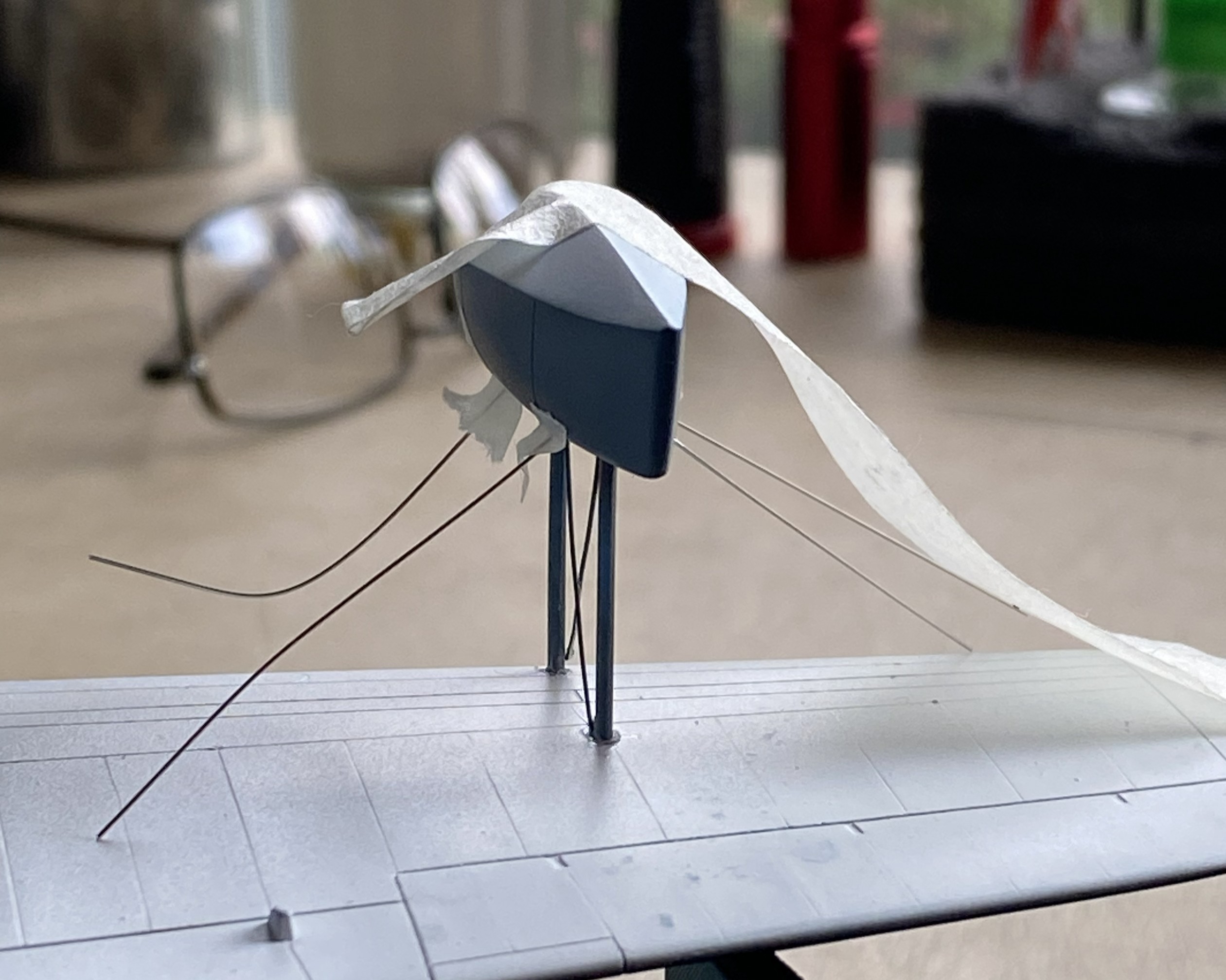 Obviously, with only two small contact patches, this will be easy to knock flat laterally. I added tape to stabilize it while I fed the ends of the braces into the float and wing for gluing (superglue). l cut the wires overlong so that I could be certain I’d be able to adjust them if I needed to (a handy bit of foresight):