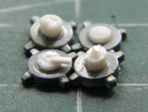 The reason for the different colored parts was due to trying to add enough black dye to white resin to color it gray without adding too much and making them black (you’ll see those black parts later in this build). The dropper of the dye bottle doesn’t “drop” as much as it dribbles. I usually (in fact, almost always) mix resin in once ounce increments and the dye is VERY CONCENTRATED. Dribbles are not as precise as drops, resulting in varied coloration in the castings. The two levers at the rear of the transmission are the shifter (the long, lighter-colored part) and parking brake (the other one). The knob of the parking brake was not to my satisfaction so I used a tiny glass bead and replaced it: