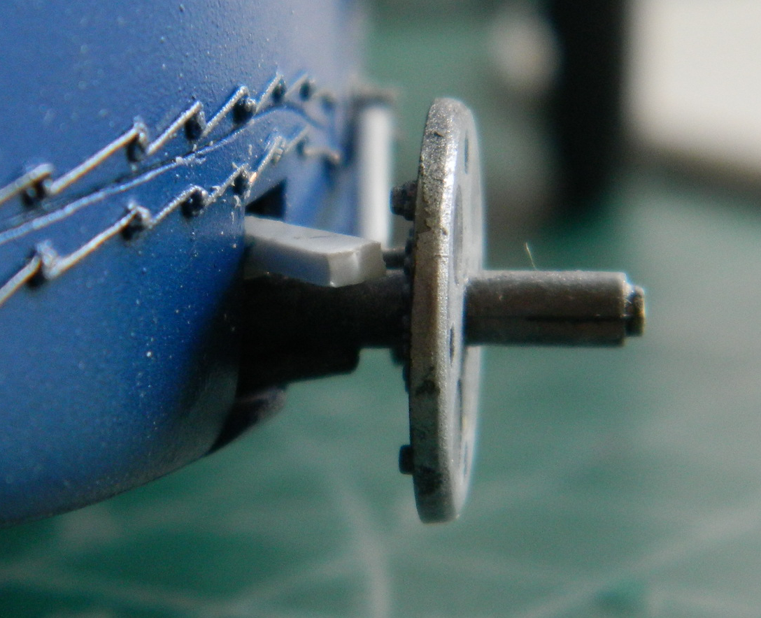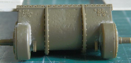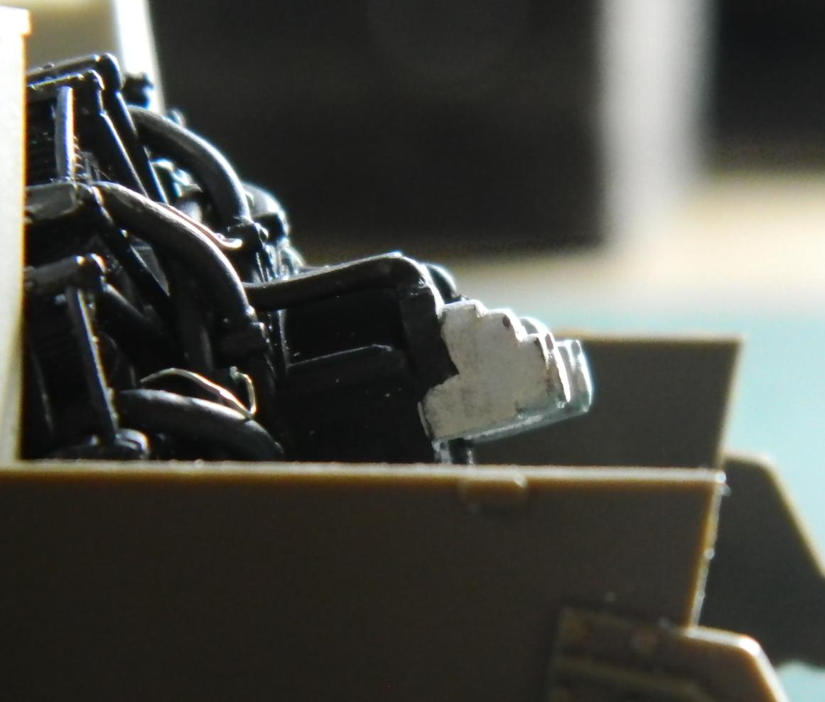 Back into the crew compartment, I started working on the canisters of the fire-suppression system. This starts with cutting away the pouring block and putting back the detail lost. It also entails reattaching the valve/gauge assembly that got knocked off (using my traditional pin and glue method):