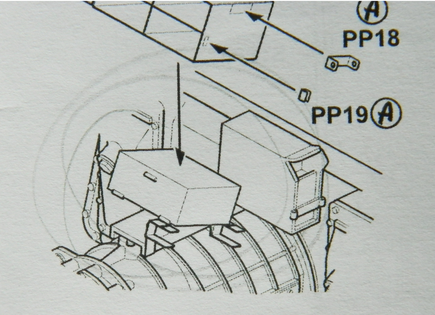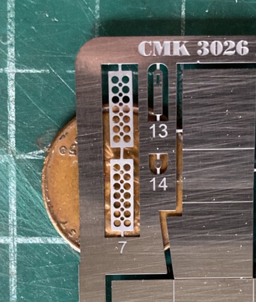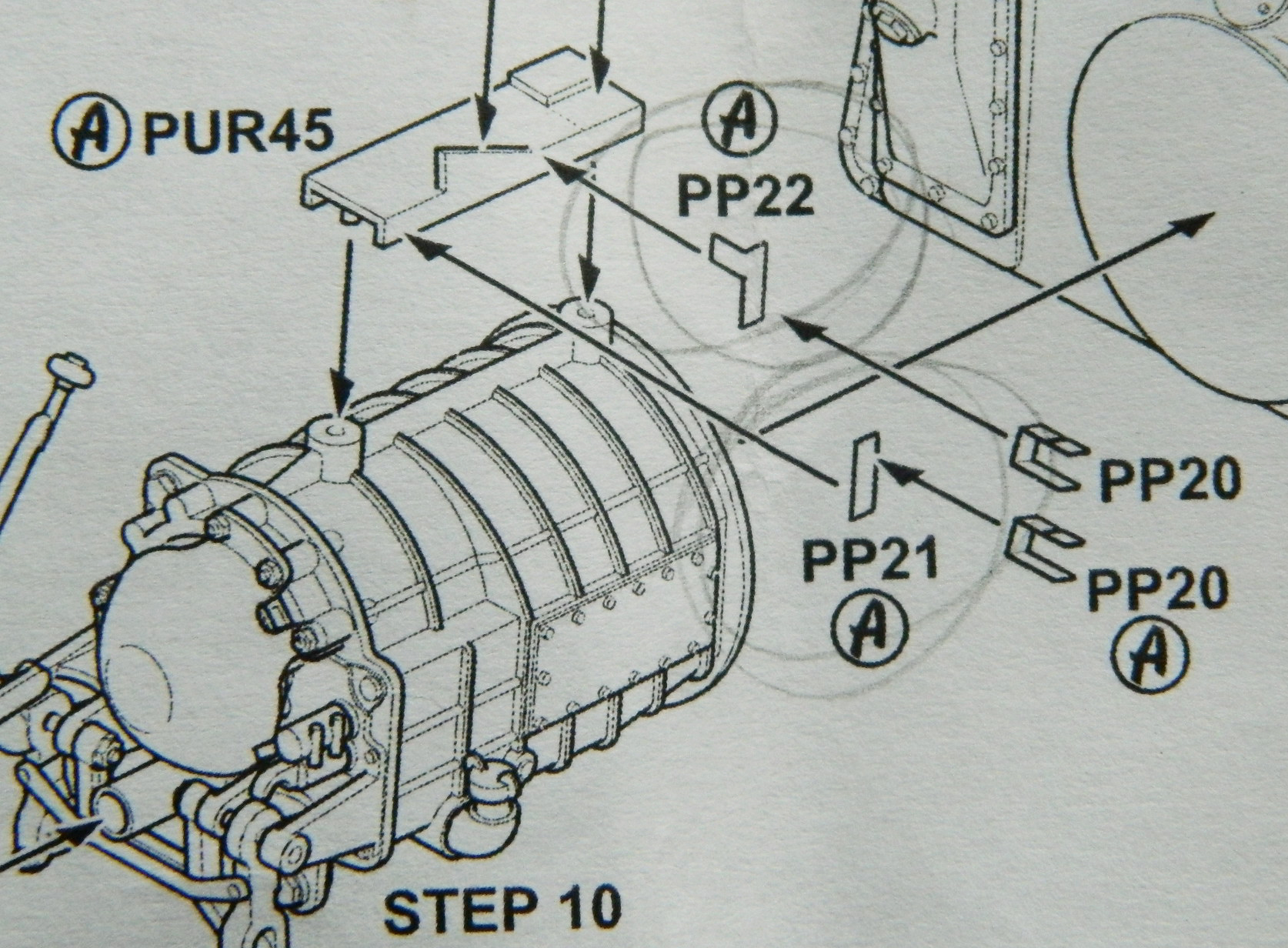 I went back to the transmission and copied some small PE parts using .005″ (.127mm). Simple parts, easy copy, but then I looked at the directions to see where they go. What I found was something a bit less than specific (the parts involved are circled):