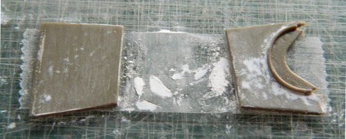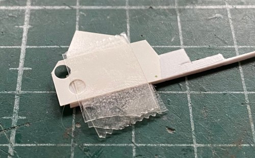 As you can see in the above photo, even by laminating the plastic, I still ended up with feathers or blow-out on the reverse side. While grumping about having to redo one of them, I stuck the piece that wasn’t missing its corner to double-sided tape and used a fresh single-edge razor blade to cut the feathering away. And then I had the notion that I probably could add styrene to the missing corner while that part was on the tape. So I did and it worked: