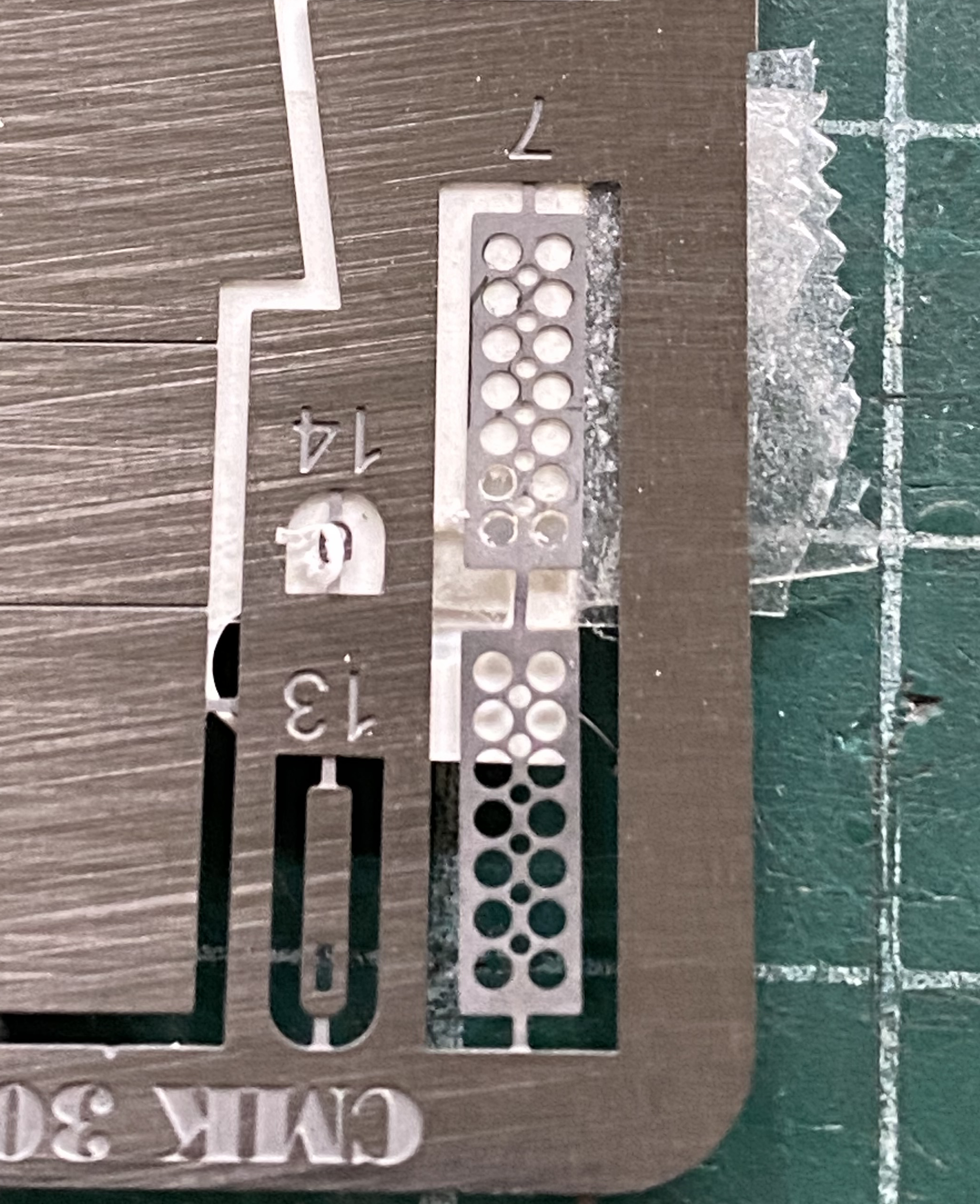 Yeah…just try to get 28 holes that perfectly aligned. Pity that I couldn’t use the PE parts as guides…oh. Wait. I can! Drilling, however, tends to elongate holes in thin material as well as create all kinds of feathering on the reverse side of the hole being drilled. I minimized that by making a sandwich (or more accurately, a temporary laminate). The drilling backing was a scrap piece of .040″ (1.016mm) styrene onto which I stuck a piece of double-sided tape, then the .005″ (.127mm) styrene I wanted the parts to be, another piece of double-sided tape, and then a piece of .020″ (.508mm) styrene on top of it all. Then I used the PE parts as my drilling jig (I didn’t drill out the tiny holes because evidently even my nit-picking insanity has limits) (who knew?):