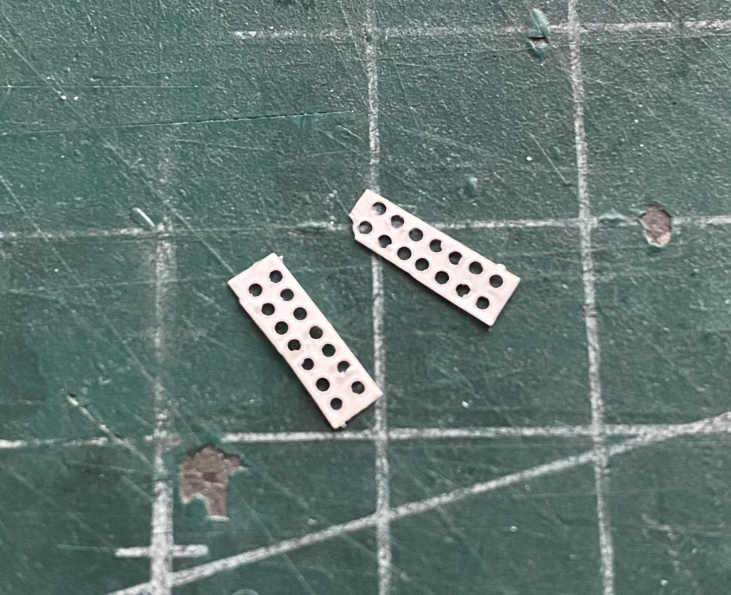 One of the tasks that was hanging heavily over my head was the reinforcements that were part of the seats’ backs. The AM set offered PE parts, but why do that at this point? Instead I figured out a way to do them in .005″ (.127mm) styrene. I had made the box itself from copper shim stock because that part has structural requirements (albeit slight). Rather than do the partitions in copper, I used styrene. But look at all these holes I have to drill: