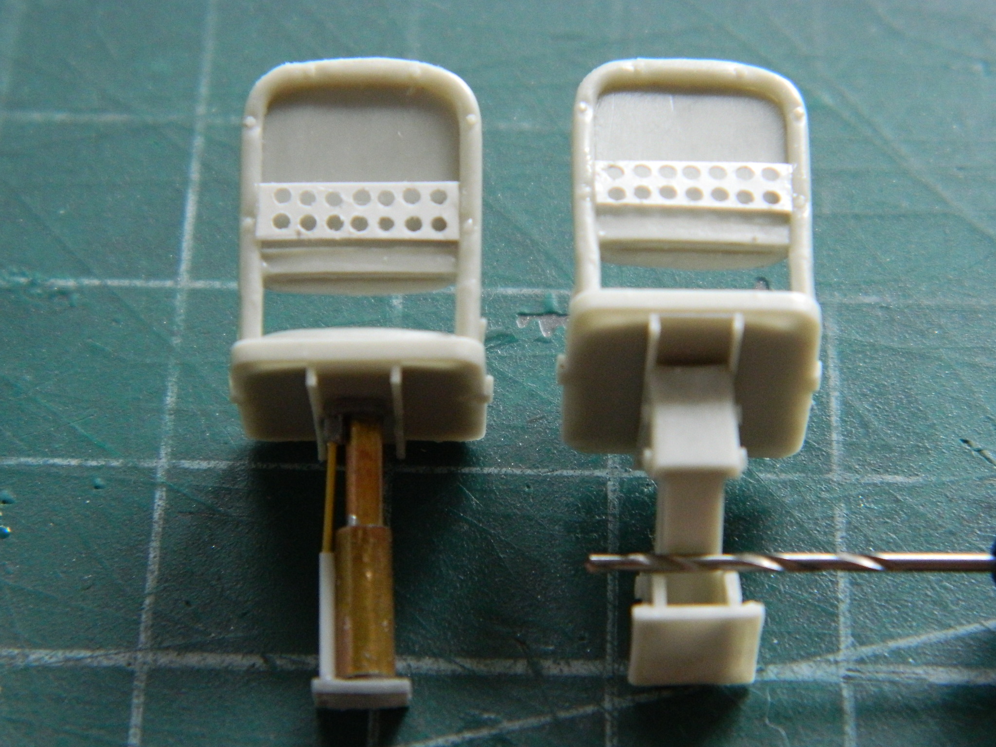 For whatever reason (craziness, perhaps?), I like altering the heights of these seats. The driver’s seat mount was utterly different from the co-driver’s seat mount. Instead of a parallelogram pedestal it was comprised of a telescoping column. That’s a lot easier to adjust than the height of a fragile and tiny parallelogram (#90 is the telescoping pedestal and the copper tubing and styrene rod made altering the height possible):