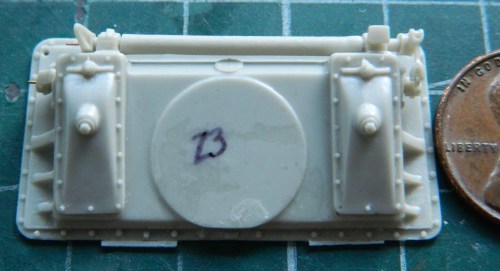 The upper engine covers are three parts, of which two bolt into place. The front engine cover (which is the one I bitched up) has the air inlet for the engine’s cooling fan (obviously, Shermans with the Continental radial aircraft engine are air-cooled), as well as a couple of armored fuel cap covers.