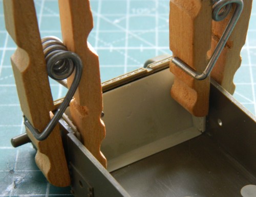 It was while I was trying to dry-fit the hull parts to act as light blocks that I noticed they didn’t fit correctly. In order for the fit to be less off, I had to break loose the right side of the hull and reposition it slightly. In the photo below, almost centered under the square opening for the pistol port you can see the light color where the panel had originally be glued. It took three clamps to get things to stay in position long enough for the glue to set up: