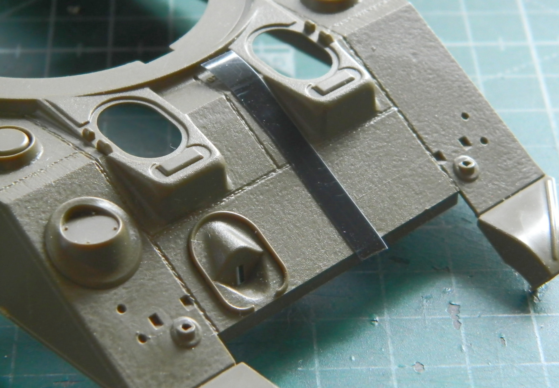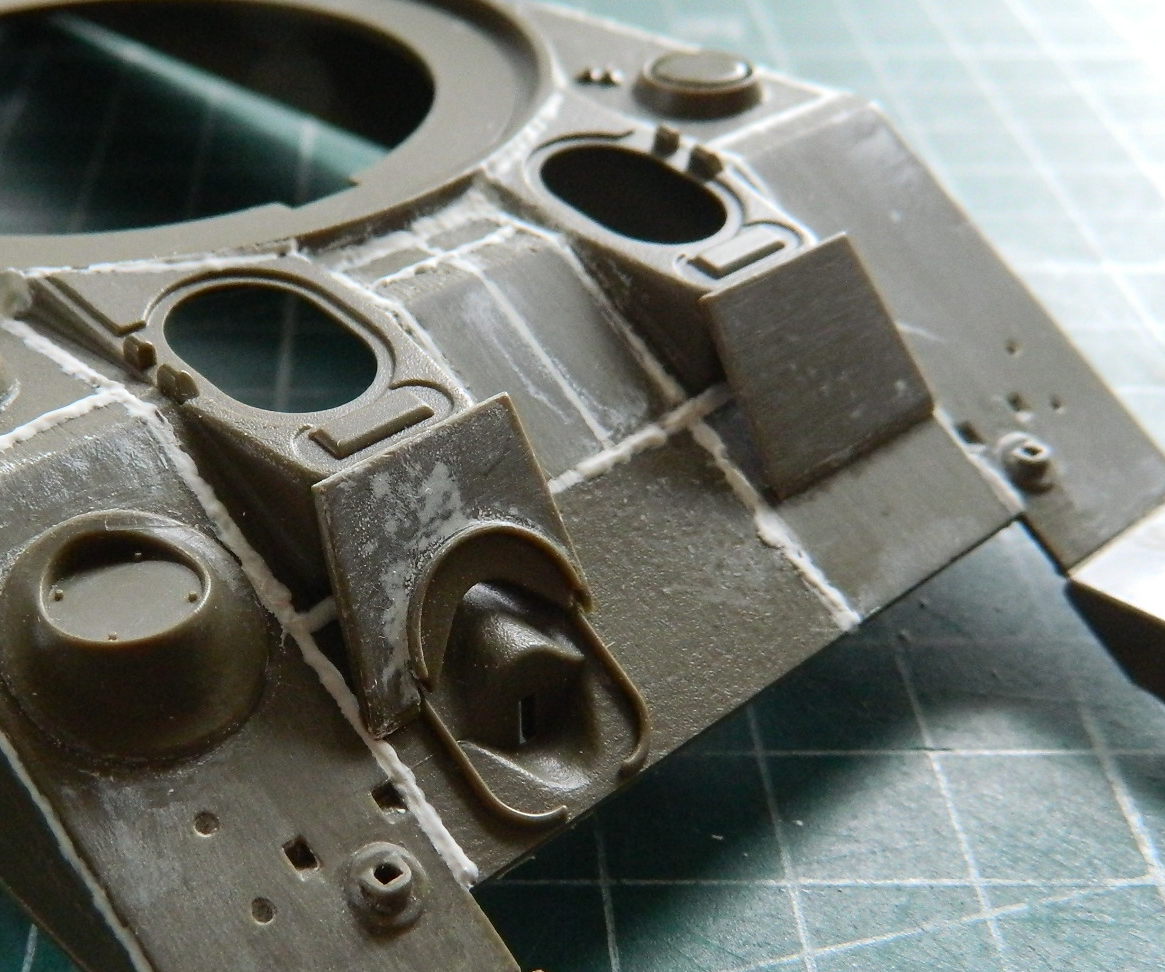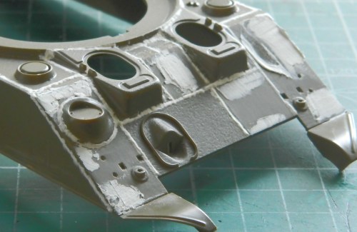Where the AM sponsons attached was treated with 3M’s Acrylic Putty (because this was during Tamiya’s “Nobody will ever see under here” phase and didn’t bother to include sponson bottoms with the kit). The sponsons were welded and I’ve not seen any seam here so that gets puttied: