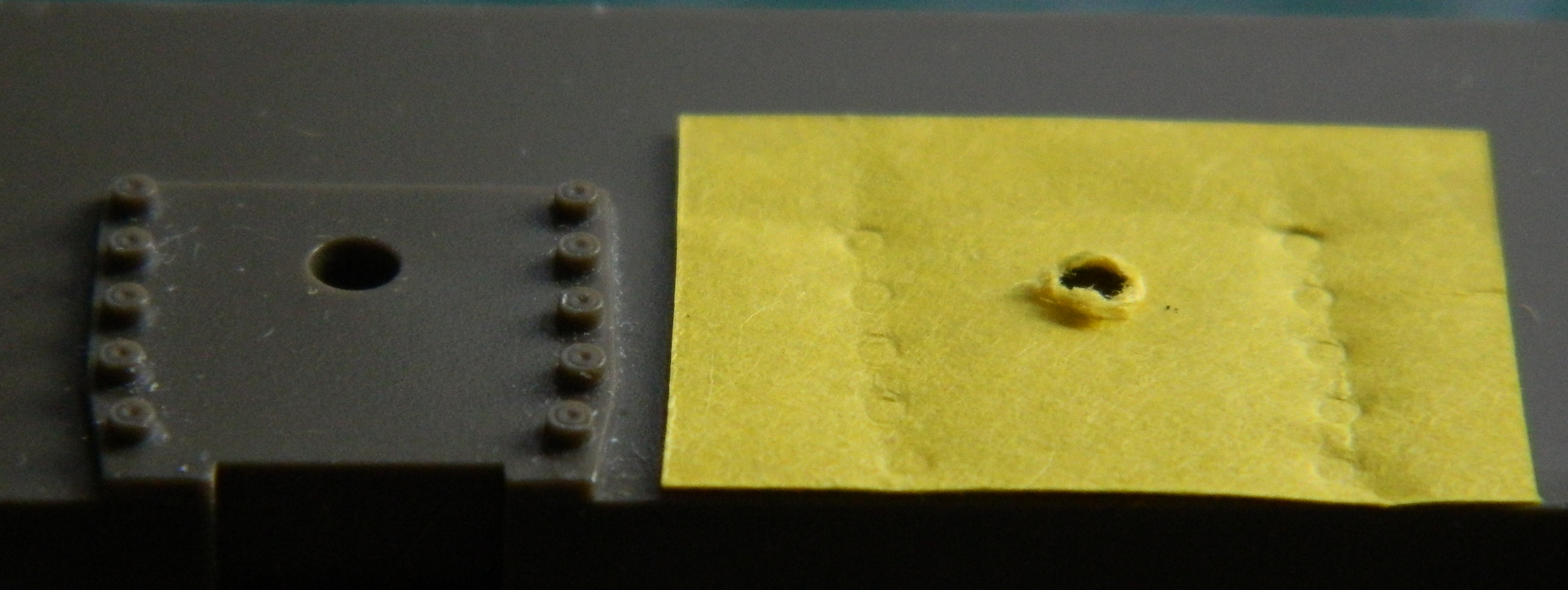 I punched out the appropriately sized discs to use for the drains (which are what those round bits on the bottom are). When I have to center a disc over markings, being able to see the markings makes things much easier (and accurate). To enable this, I punch out the first disc…the one that locates however many will follow it…out of clear styrene: