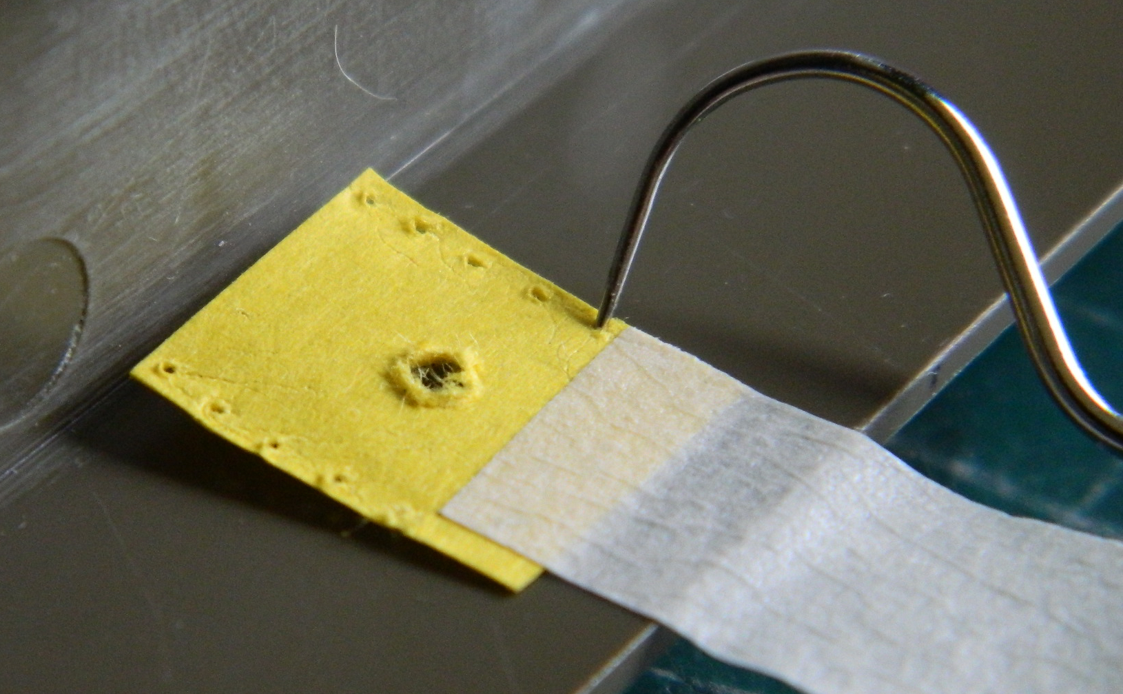 I wanted to add the lower engine access cover and escape hatch. With the locations marked, I drilled the corners of the intended openings to provide the rounded corners: