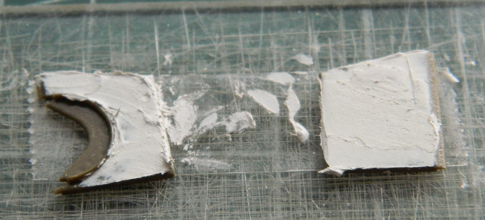You can see that it wasn’t my cleanest excision. I cleaned up and leveled the U-shaped part (on the right in the above photo) and then glued it down to a flat section of .015″ (.380mm) styrene to replace the kerf. Once glued onto it, I could see an area where the plastic of the excised part didn’t meet with the plastic of the kerf replacement. I added a couple of pieces of .010″ (.254mm) and .005″ (.127mm) to fill in the gap: