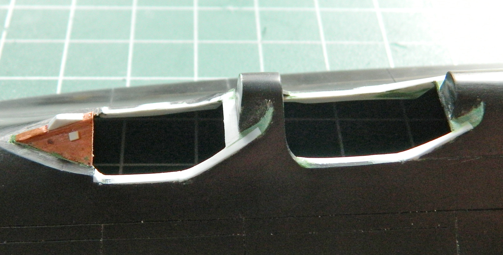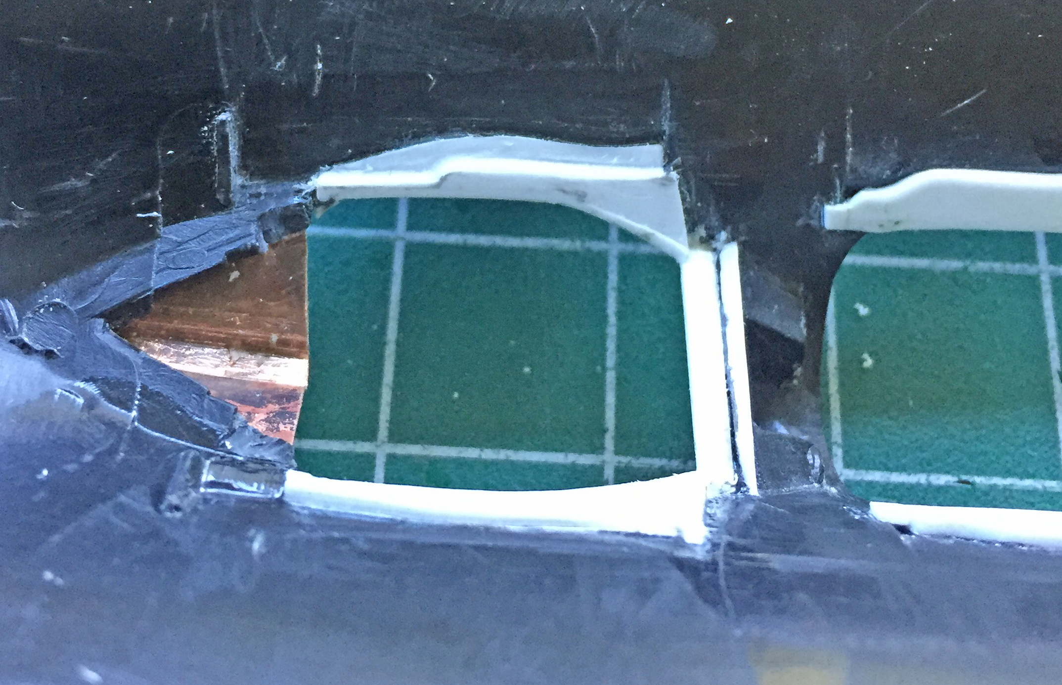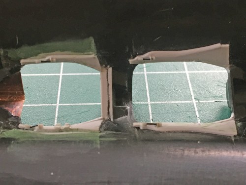 Having gotten all four sills to (relatively) fit, they were glued into position. There was a small gap at the edges of all the sills where they (relatively) met the side of the cockpits. That gap would need to be filled.