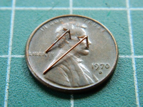 These cylinders aren’t just stuck to the frame of the seats, they have mounting brackets. I made them from .005″ (.127mm) copper shim stock and used the punch and die set to start the holes and a fine (very fine) rat-tail file to open the holes to the appropriate diameter. Tip: punch/drill the hole first, then cut to approximate size and use a file to bring the dimensions down to size: