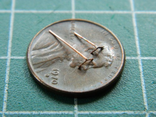 Once the glue had set, I trimmed the .025″ (.625mm) rods and center drilled them with a .0135″ (.343mm) bit: