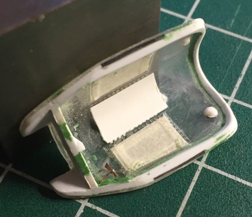 As with the rear canopy, once I’d added the plastic inside the canopy, many hours of scraping ensued. And then I noticed that the rear partition of the canopy was far too thin. ::sigh:: So that means I again get to fit plastic inside a curve (still my favorite) (spits). Once that was done I added more plastic inside the back “wings” on the canopies as the as-molded part was far too thin: