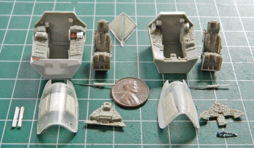 I had purchased a cockpit detail set from True Details and, totally forgetting that I had, also purchased a pair of ejection seats from Pavla Models out of the Czech Republic. My oversight ended up offering me more options. Neither of the ejections seat sets was 100% accurate, each had something the other lacked. My choice became, which of the seats’ errors/omissions would be easiest to fix? As it turned out, I’m going to use the Pavla seats (the one on the left; part of what makes them look SO different in the photo is that the True Detail seat is still attached to the pouring block and the Pavla seat isn’t):