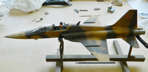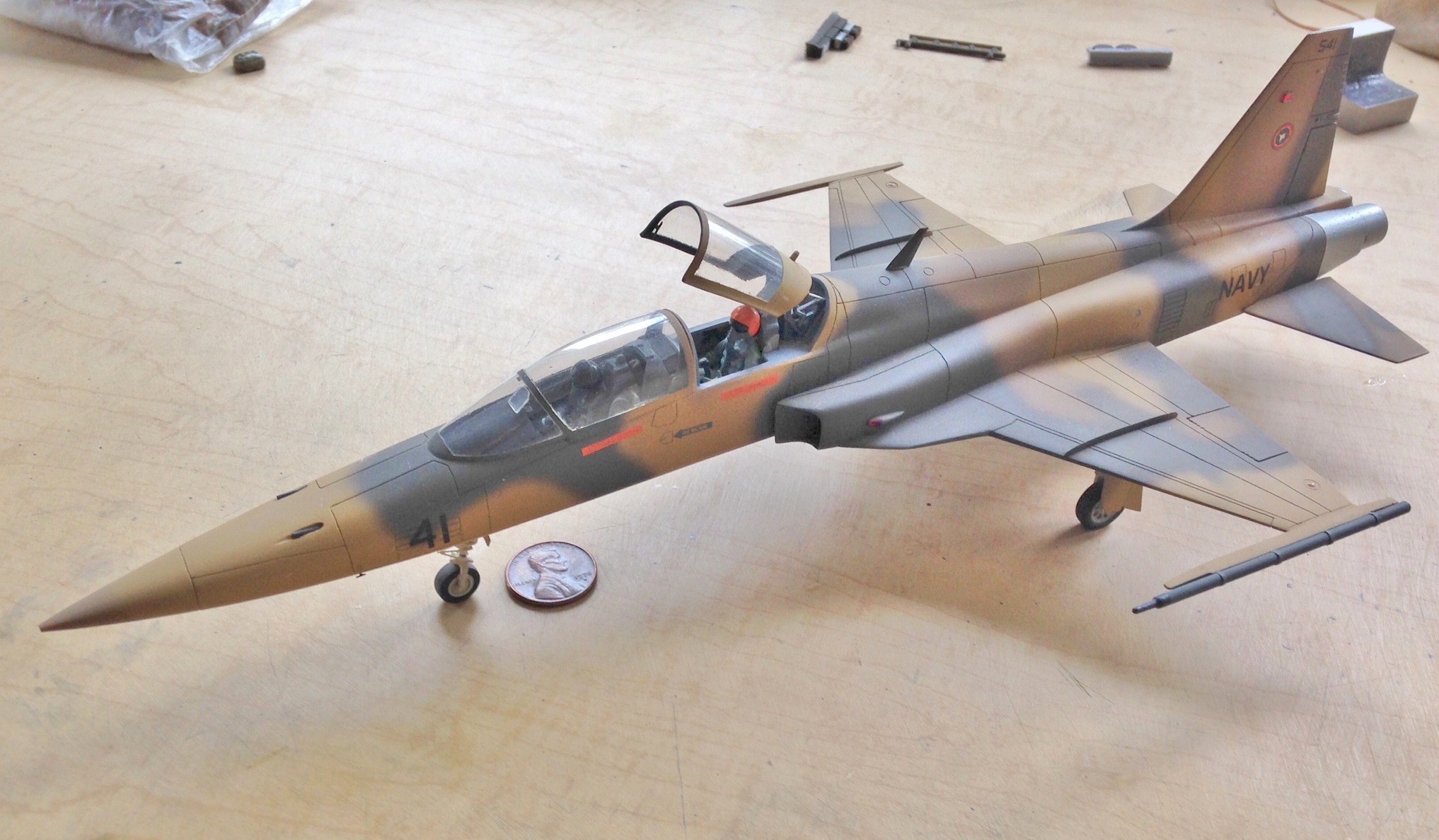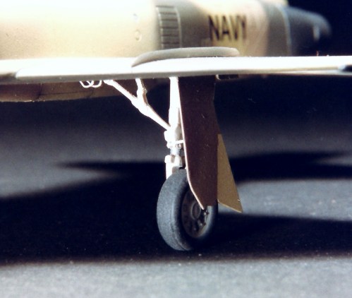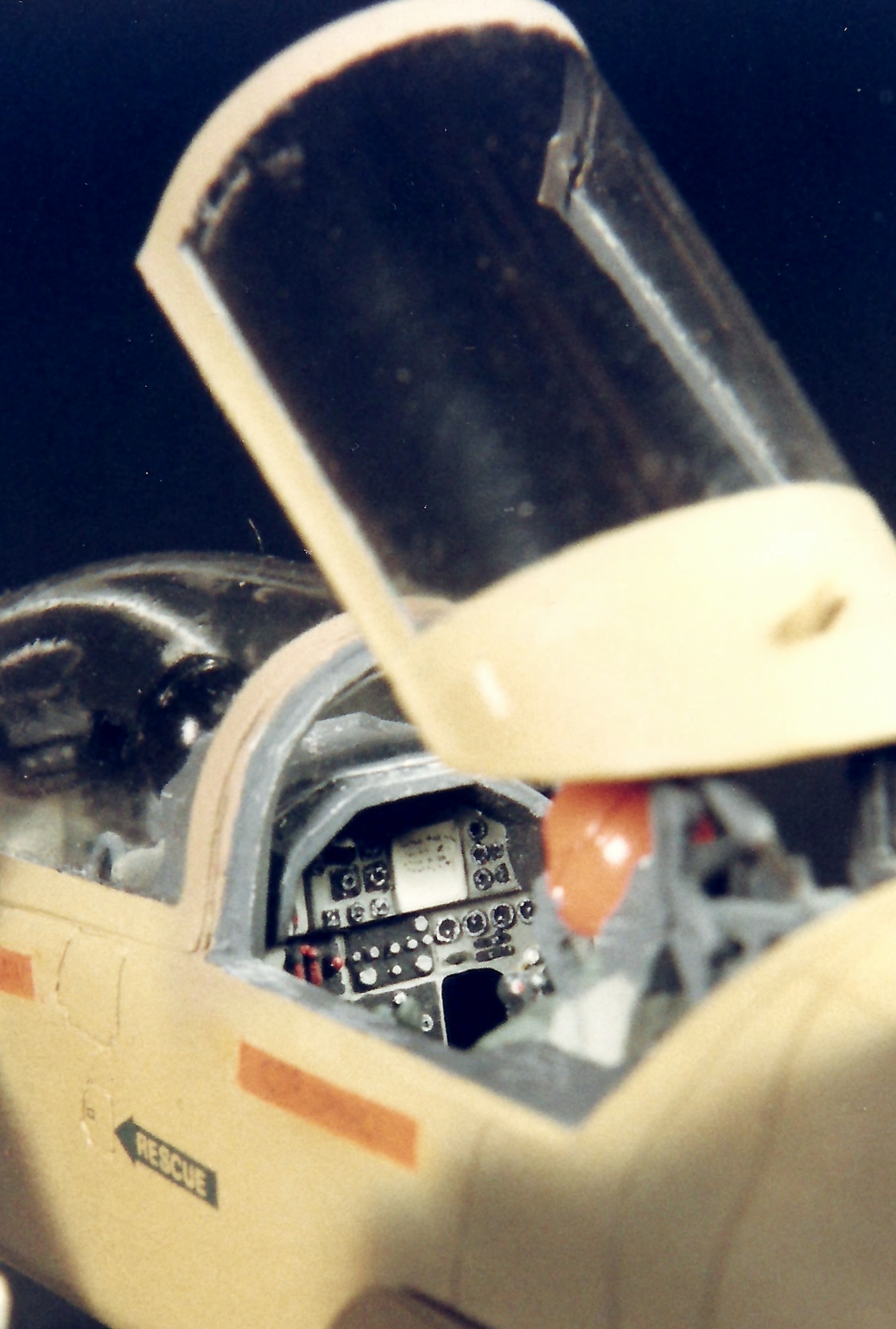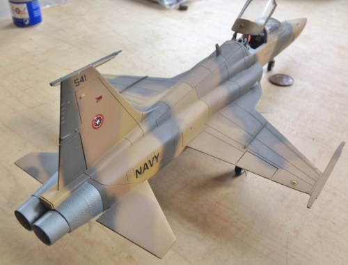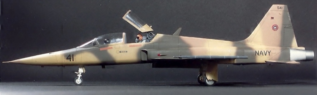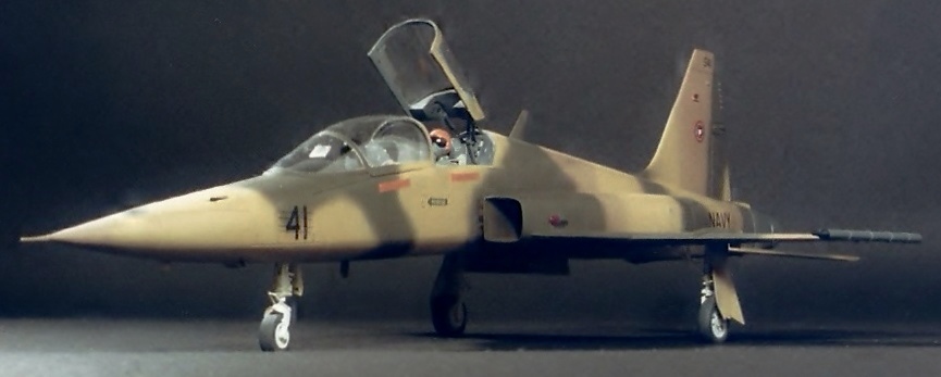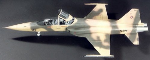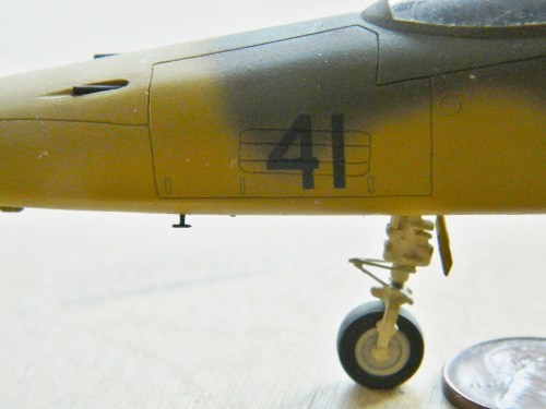 When it was built, I did a bit of detailing (not a lot). The canopies were vacu-formed (as were their inner frames), the pilot figures were modified from a Tamiya AM set, the oxygen and G-suit lines were made from guitar strings, some details were omitted from the cockpits (the Navy F-5s didn’t have on-board radar so I cut the radar screens off) and some were added (the hydraulic rams of the rear canopy hinge look like steel because they are – they’re straight pins), the formation lights were made from translucent toothbrush handles, hoses and lines were added to the landing gear (and the gear doors were scratch-built), and this was my first (somewhat poor) attempt at scribing panel lines.