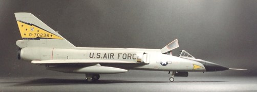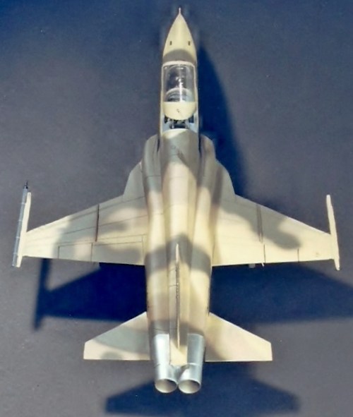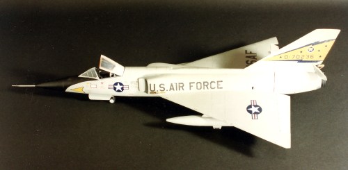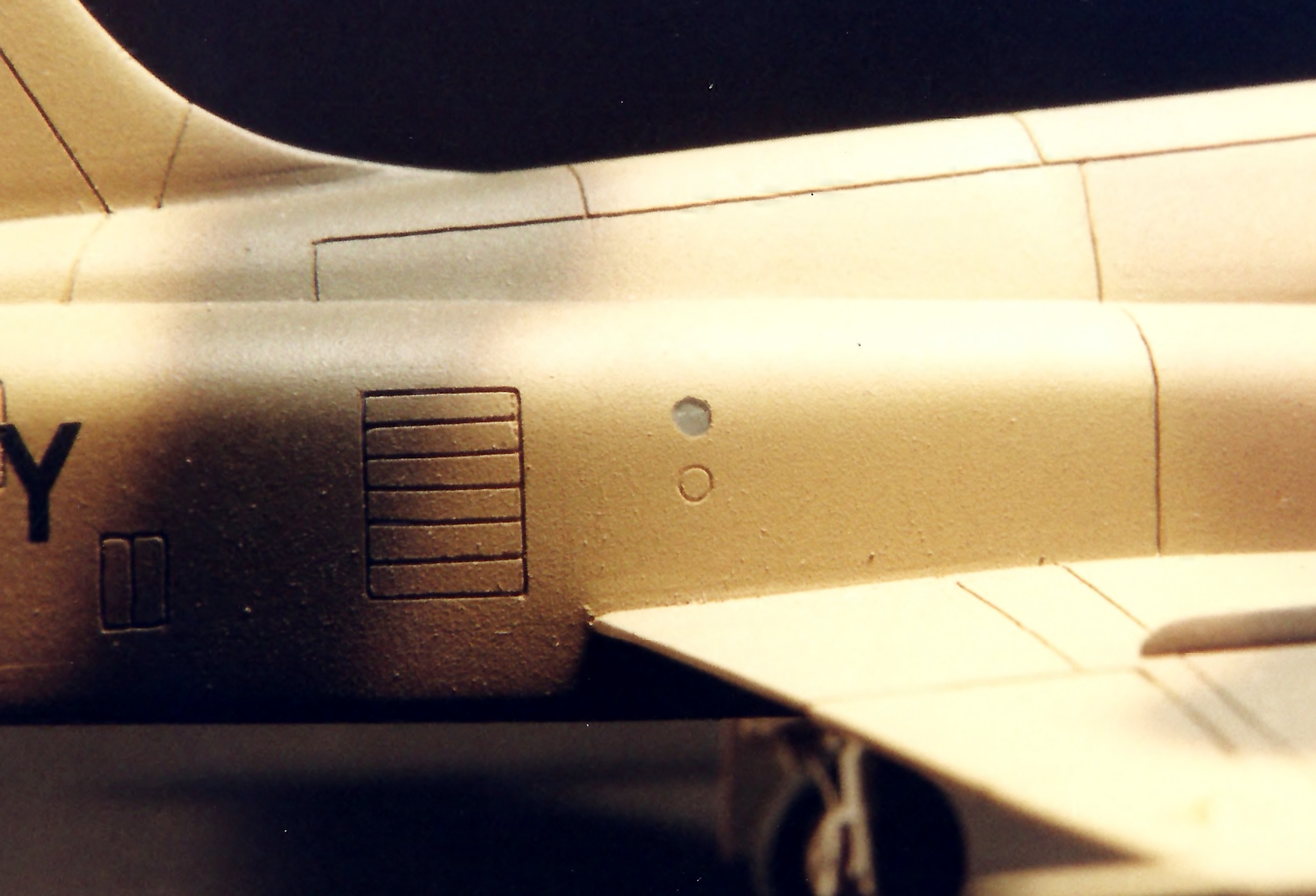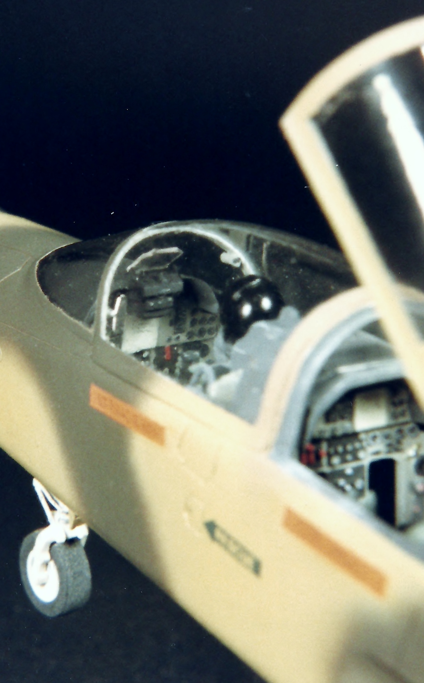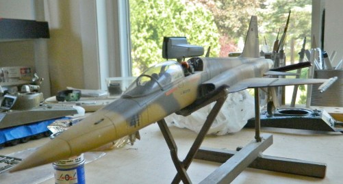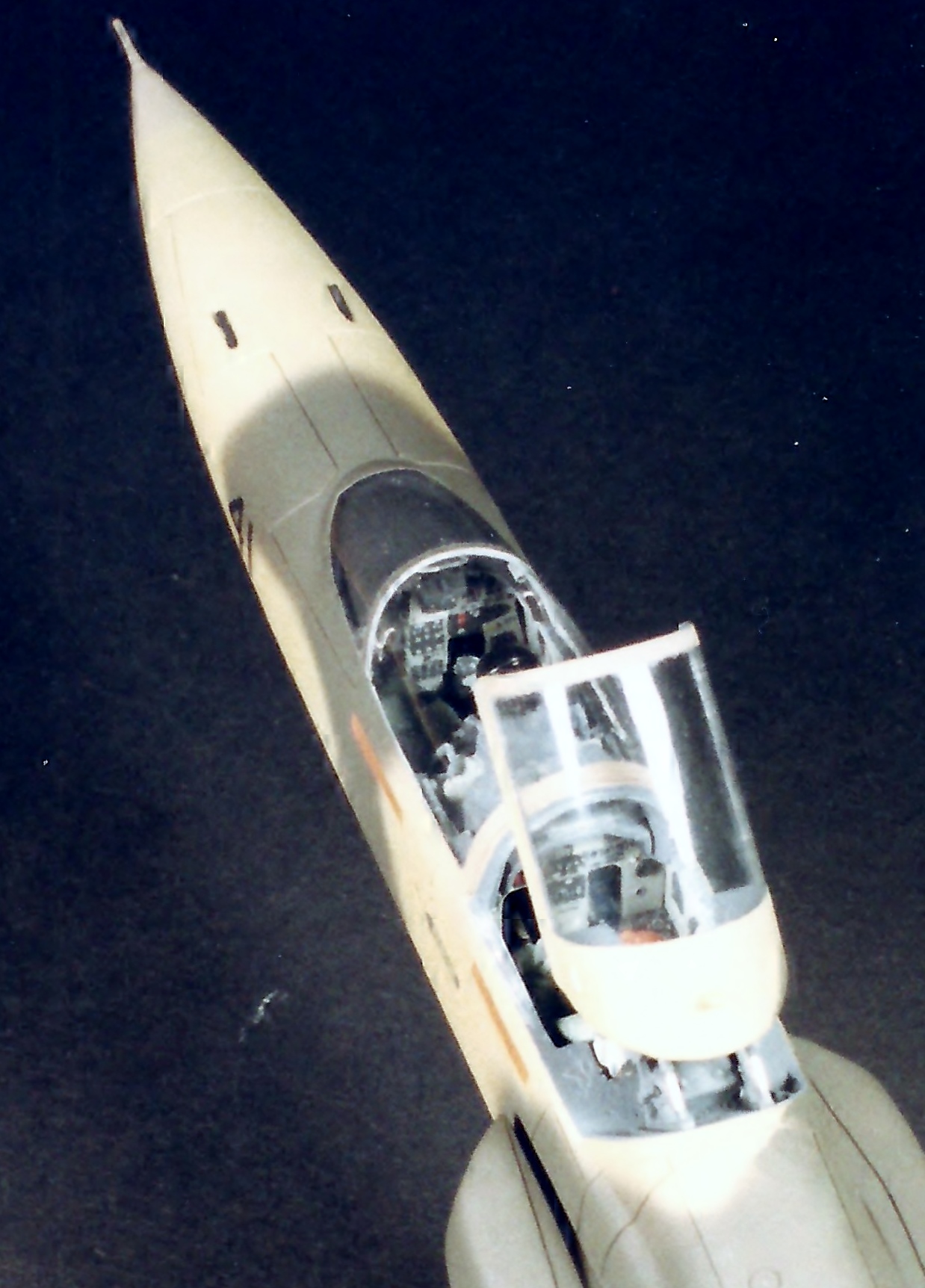 When it was built, I did a bit of detailing (not a lot). The canopies were vacu-formed (as were their inner frames), the pilot figures were modified from a Tamiya AM set, the oxygen and G-suit lines were made from guitar strings, some details were omitted from the cockpits (the Navy F-5s didn’t have on-board radar so I cut the radar screens off) and some were added (the hydraulic rams of the rear canopy hinge look like steel because they are – they’re straight pins), the formation lights were made from translucent toothbrush handles, hoses and lines were added to the landing gear (and the gear doors were scratch-built), and this was my first (somewhat poor) attempt at scribing panel lines.