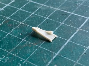 With the distraction of hull work attended to, it was time to turn my efforts back towards getting things ready in the crew compartment. One of the things I had to do was to make a clevis to replace the one that got lost. I used a piece of resin pour block instead of styrene because of how flexible styrene can be. This is a really small part and I wasn’t confident that the plastic would hold up while I cut and whittled the shape I needed. Resin can also be flexible, particularly when warmed, but a quick dunk in cold water returns its rigidity. That process started with cutting a small piece of resin to work on: