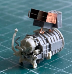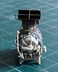 Symmetry also required that I add putty to a few areas and the really nice thing about that is that this material will bond nicely to itself even if what it’s being added to has already cured. What fueled my excursion to Cranial Suppository Land (this time it was 3D printing…not that I think one needs to have their cranium up there to print 3D parts, it’s just not for me) was the fact that I needed the hollowed out area to fit over the bell housing of the engine. I doubted my ability (rarely a good thing, overall) to thin the sides out sufficiently without causing them to chip and break to uselessness. There was reason for caution, but not the cognitive disconnect I indulged in. Even being cautious, a few places chipped and broke away. One place I could superglue the chipped section back, but most required the addition of more putty. Perseverance won and I got it to fit over what it need to fit over: