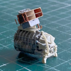The whole section in front of the seat has to come off. That leaves me with nothing much to put there so I have to scratch-build the transmission. I was off to a roaring great start before I realized I was copying the wrong variant! Well, there’s another addition to my scrap styrene stock… I made a block of Aves AepoxySculpt and started whittling away at it: