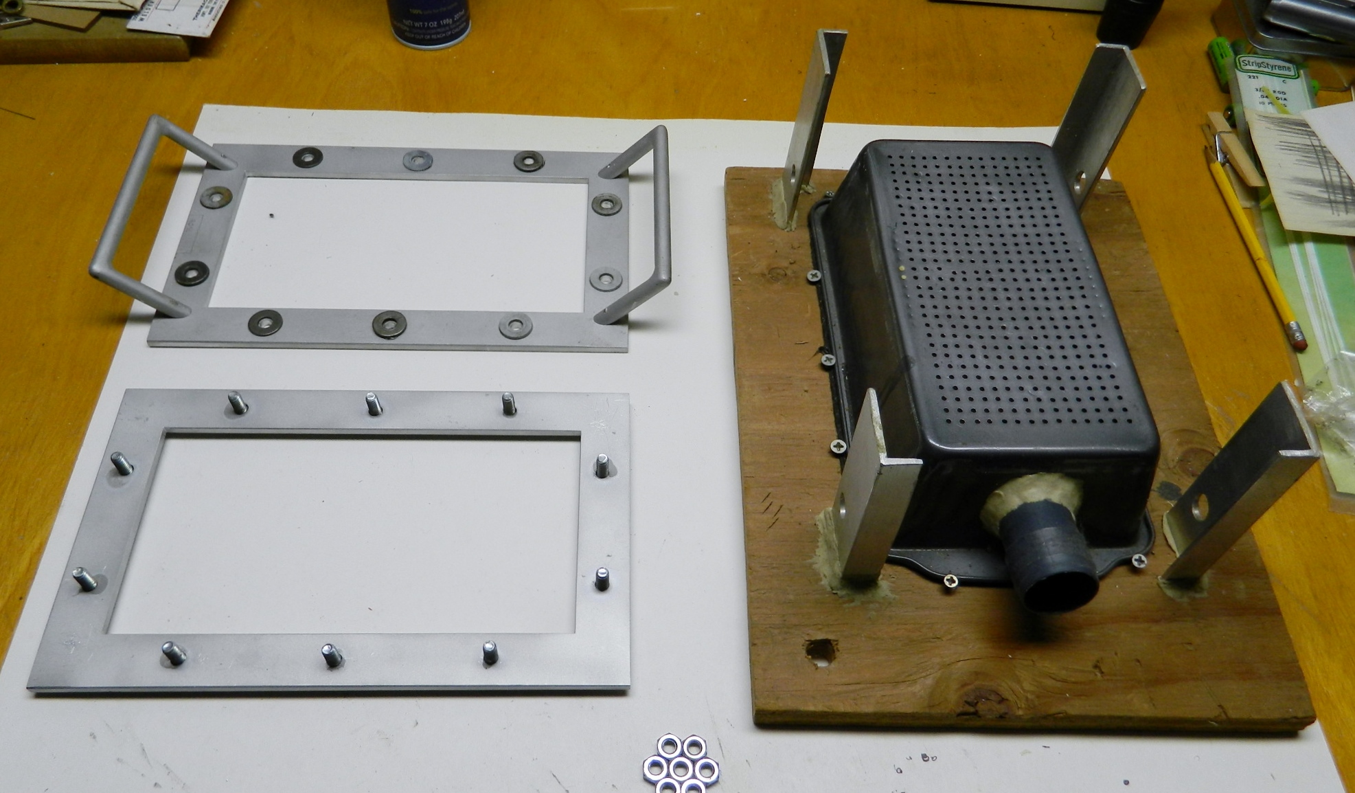 The purpose of the frame is to hold sheet styrene (or butyrate) firmly over a heat source (I use an electric hotplate but an electric stove works also). Here’s where I got a little fancy. I had a friend who worked in a machine shop make a frame (two frames, actually) for me from 3/16″ aluminum plate (anything sturdy will do). I sized the inner opening to be just slightly larger than the bottom of the bread pan and the width of the frame to be an inch. I used bolts and wingnuts to hold the two frames together (once all the holes were drilled, obviously, I used superglue to hold the bolts in place), and I guess he was having a boring day at work because he also made me two nice handles for the frame (comes in handy when protecting the delicate fingers from holding this over heat).