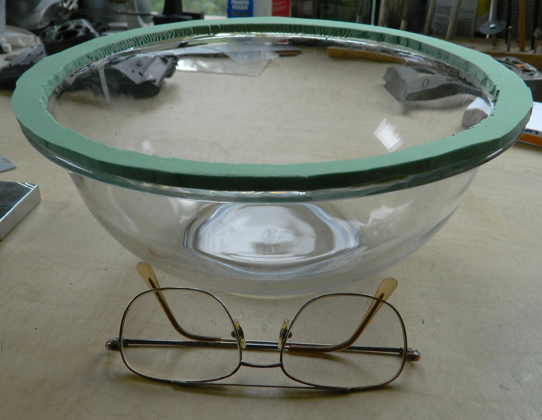 I used Contact Cement on the lip, turned the bowl over and placed it on the foam, then I added a few pounds of weight to the bowl to ensure a good seal and bond: