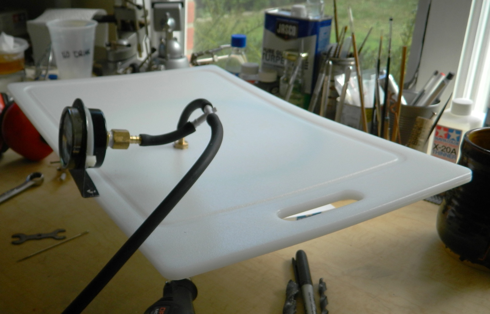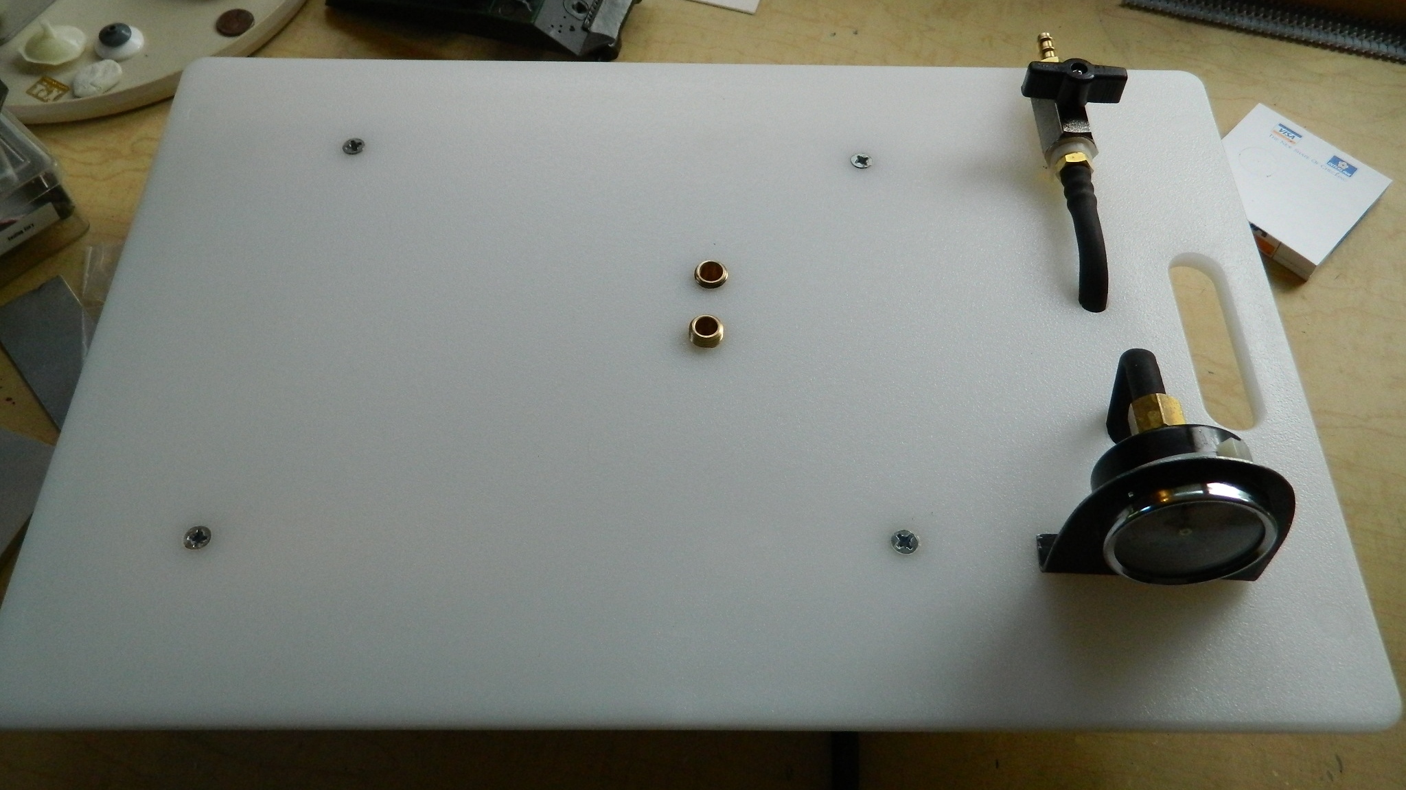 Because each component of this chamber could leak, I decided to test each component as I added it for vacuum tightness to make fixing what leaked easier. As with the V1.0 version of the pump, there was a V1.0 version of the chamber (which didn’t work; don’t use plywood for the base). I’d already checked the gauge and release valve for tightness, so each time I drilled a hole and screw a fitting in, I tested it: