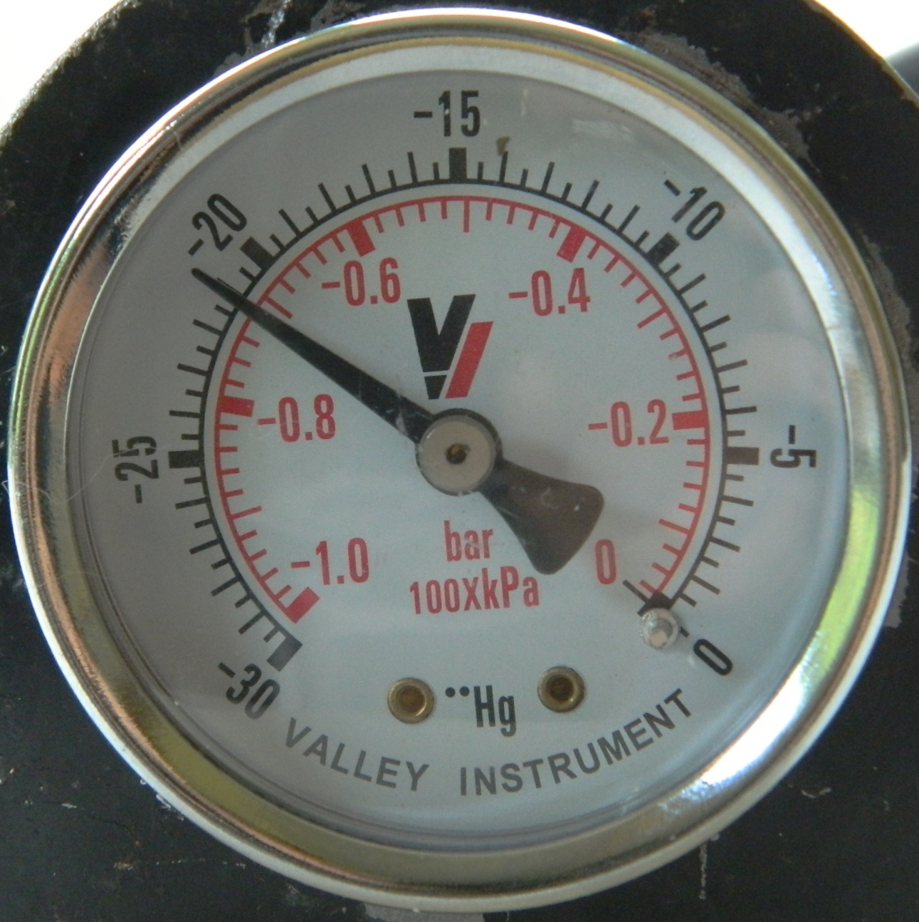The vacuum pump I made from PVC pipe and fittings worked okay. Pumping myself into a frenzy only got me slightly over 25″ of vacuum, which was acceptable for my uses. However, it was the “frenzy” part of using it that got to be expensive. My back is made from glass rods and broken promises and it does not respond well to anything that has “frenzy” attached to it.