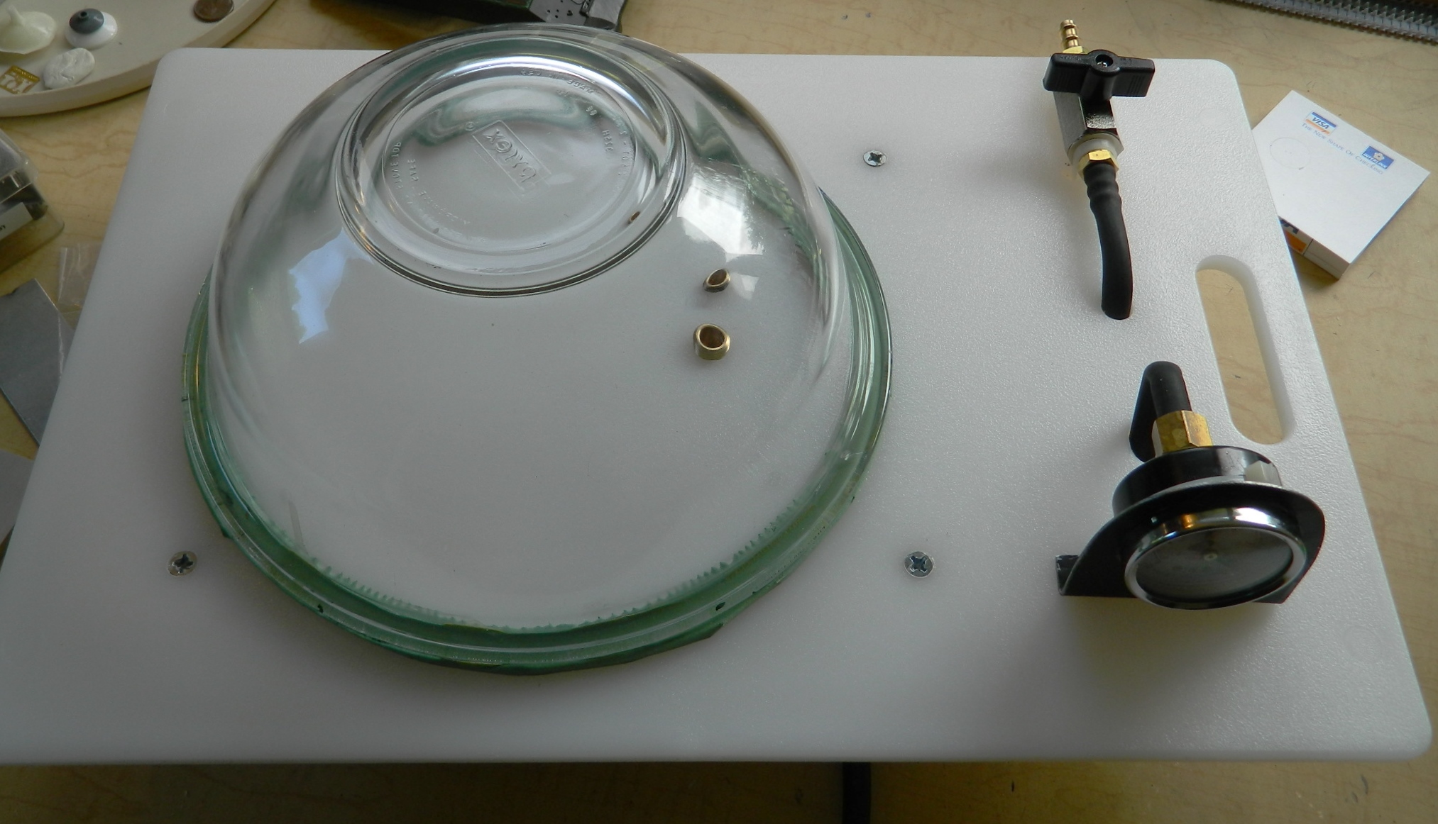 One way to get those bubbles out of solution is to expose the mixture to a vacuum, which by definition is a pressure less than atmospheric (getting a hard vacuum is possible, just expensive, and I’m a hobbyist, not a manufacturer). The bubbles, having been formed at normal atmospheric pressure (15 lbs/sq.in, if memory serves), are pulled out of the mixture by the drop in air pressure (partial vacuum) and then pop. To do that, one needs something to create the vacuum (a pump) and some place to contain and maintain the vacuum (a vacuum chamber).
