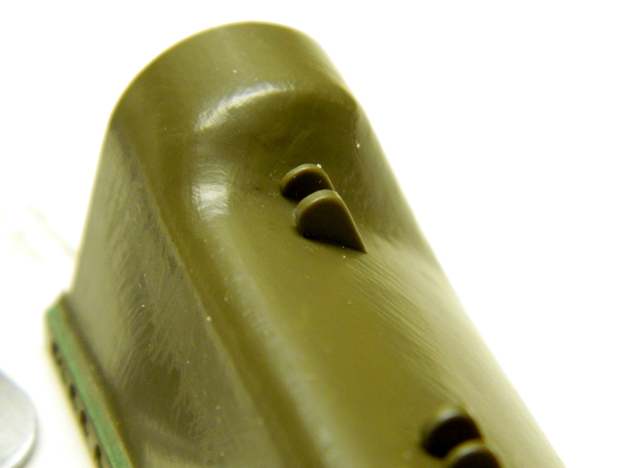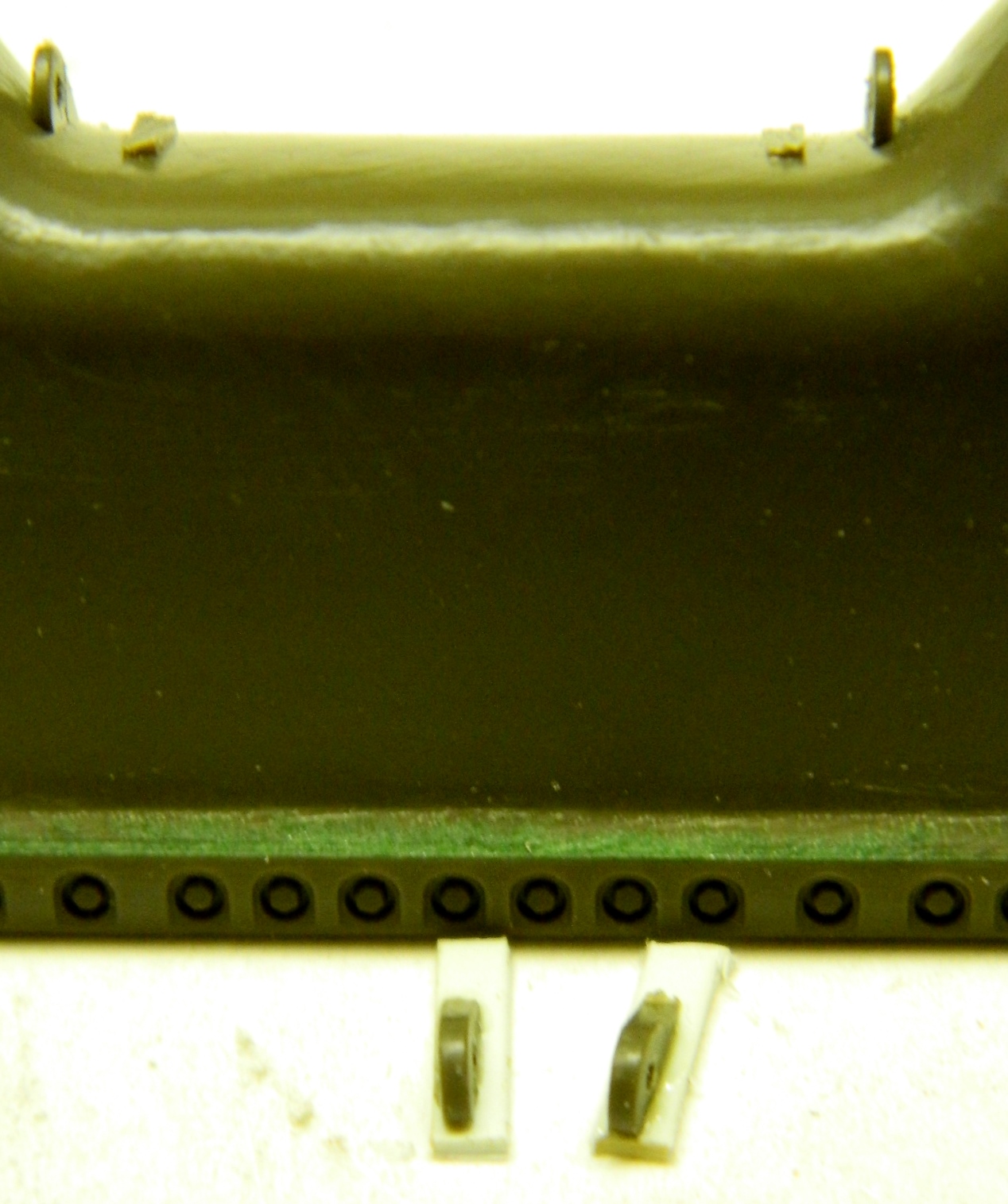 Once the holes were drilled out, I trimmed the sides of the added styrene, glued them back into place, and filed and sanded them: