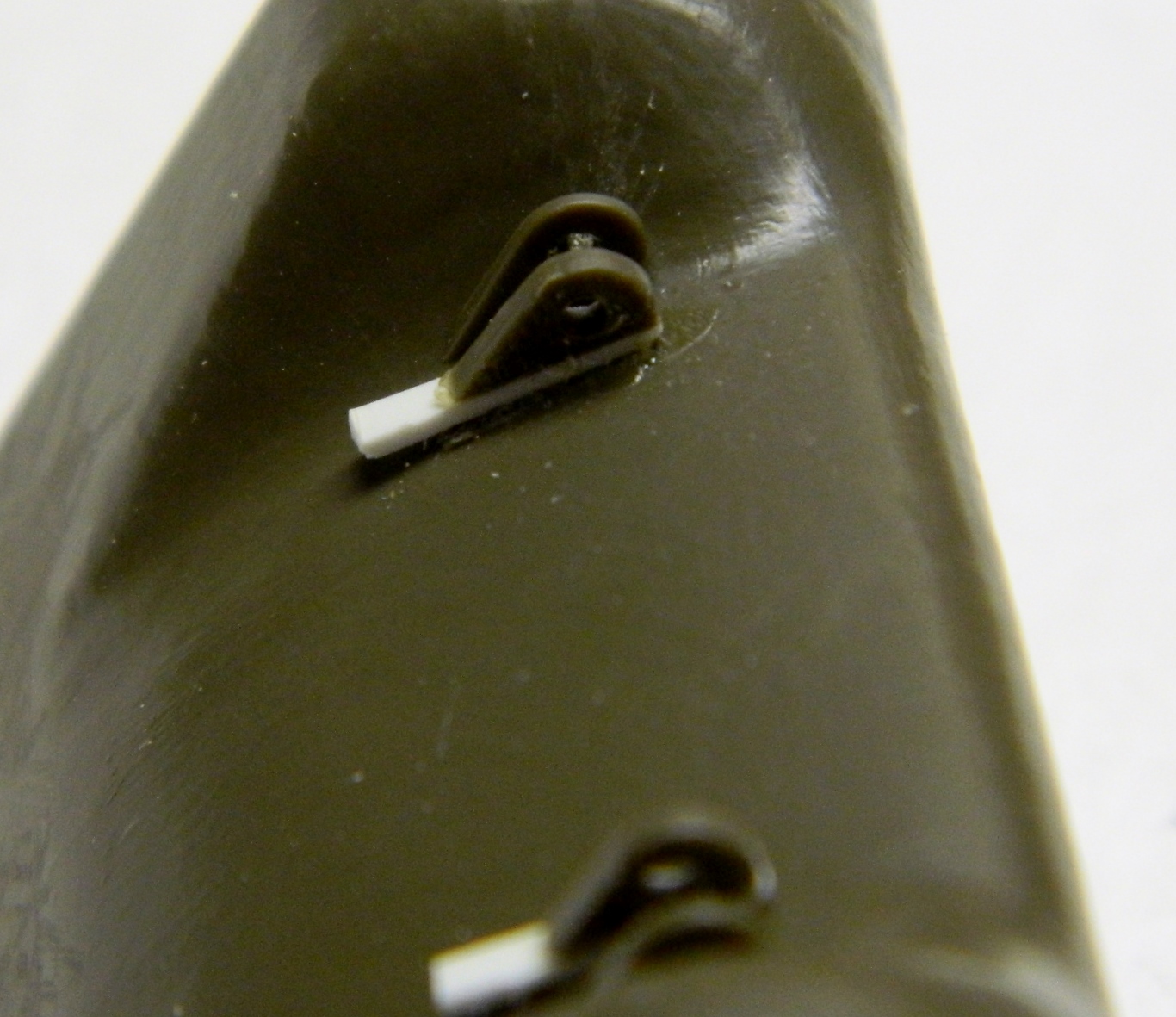 While the back of my brain worked on what to do next back there, I wanted to fix something that needed to be done due to the limitations of injection molding. The front tow hook mounts. There need to be holes drilled in them. But because of their location and the shape of the part, there was no way I could get in there with a bit to drill them out. So I had to remove them. But the kerf of the saw (the width of the cut made) meant I had to replace the thickness with styrene, so once I had the tow points removed, I added .010″ (.254mm) styrene: