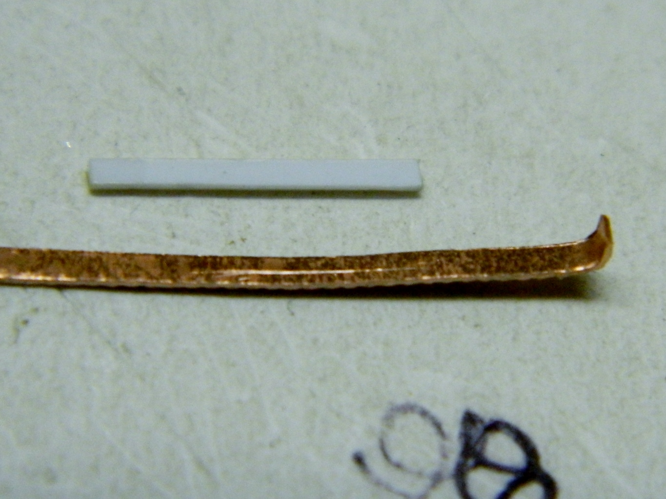 While I was working on the front towing mounts, I decided to add something that was a common field modification. Steps were welded to the nose at the towing points to ease mounting the tank. I had started to use .010″ (.254mm) styrene but decided that .010″ (.254mm) brass shim stock would hold up better: