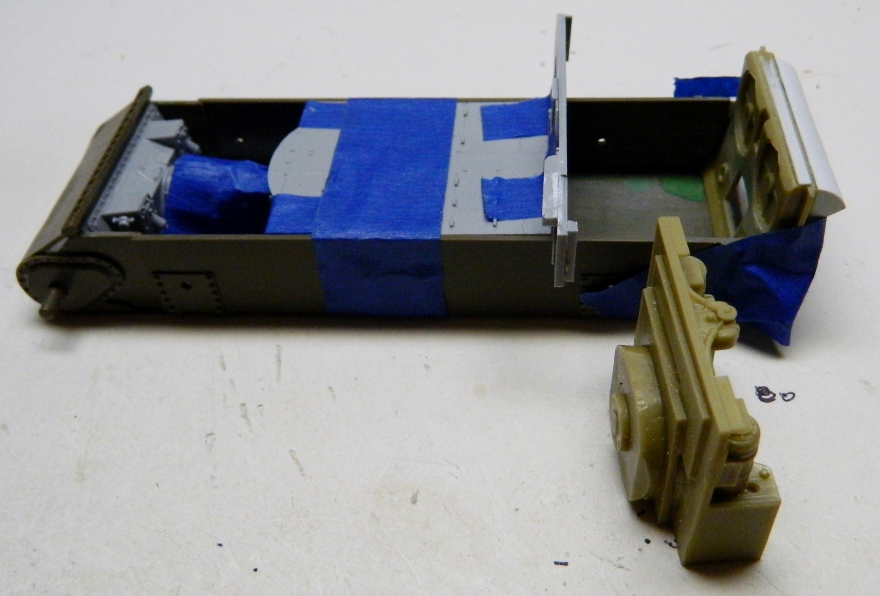 Next I wanted to work the interior parts so that both crew and engine compartments would fit in the same hull. And many hours of dry-fitting begins. First I realized that the large blocks of resin on the back of the engine bay’s forward wall (the tan part, lower right) needed to come off. It didn’t fit at all with the rear crew compartment bulkhead: