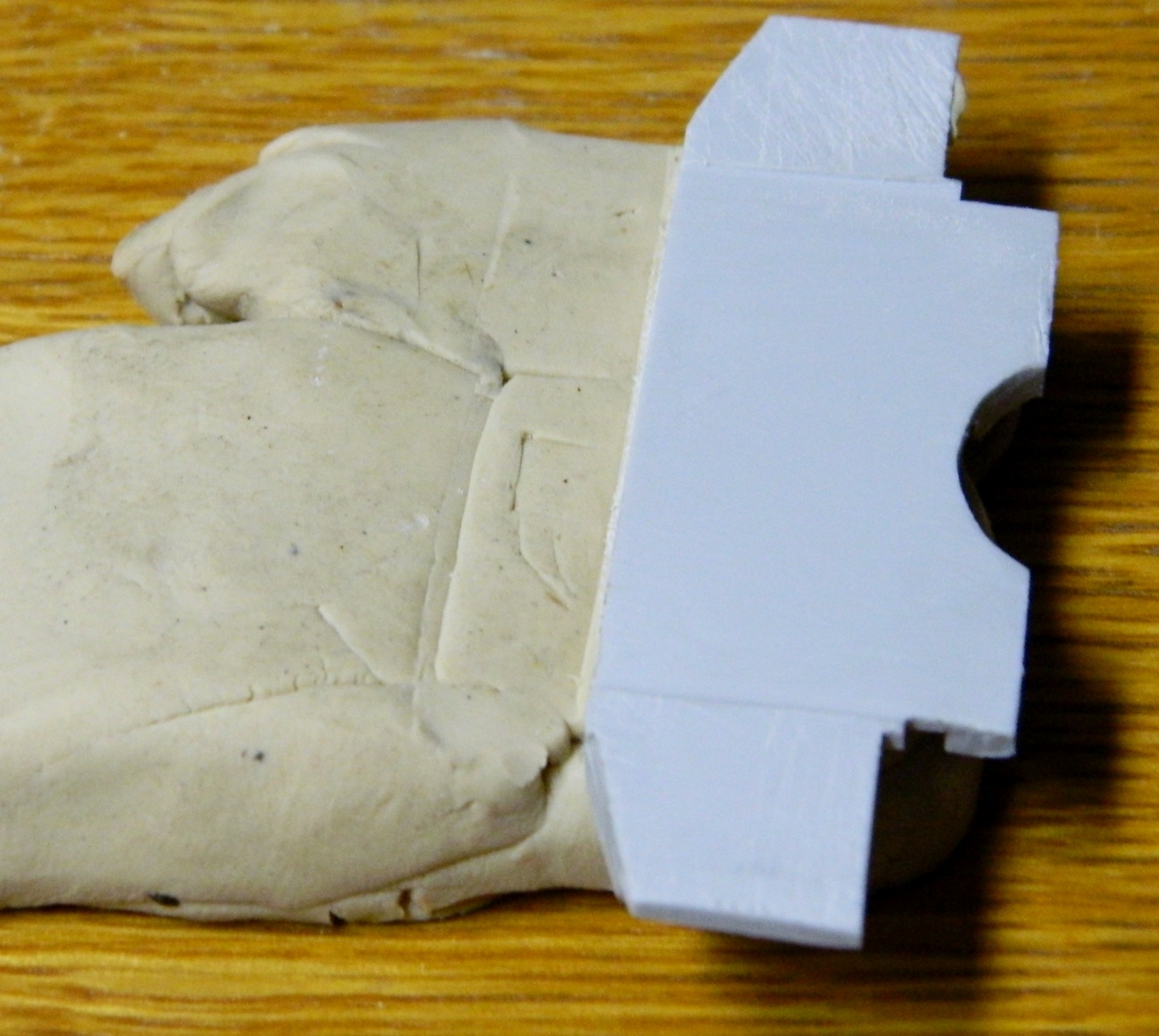 So there was more sitting there for a while and just looking at it when the other synapse closed that hasn’t operated since Nixon was President (first term). What I needed to do was to figure out some way I could support a very irregular surface evenly. Well. As it turns out, I have enough plastilene to (literally) choke a horse (though why a horse would eat a block of plastilene escapes my understanding). I bedded the face of the bulkhead down into the plastilene which in turn supported it evenly…and I filed away half the bulkhead: