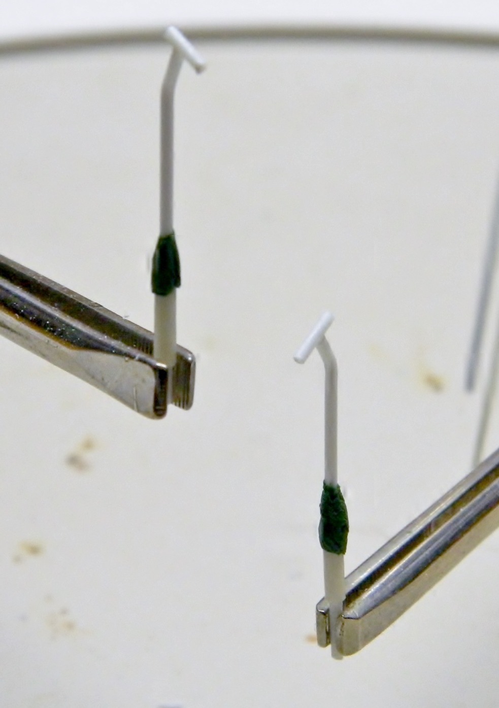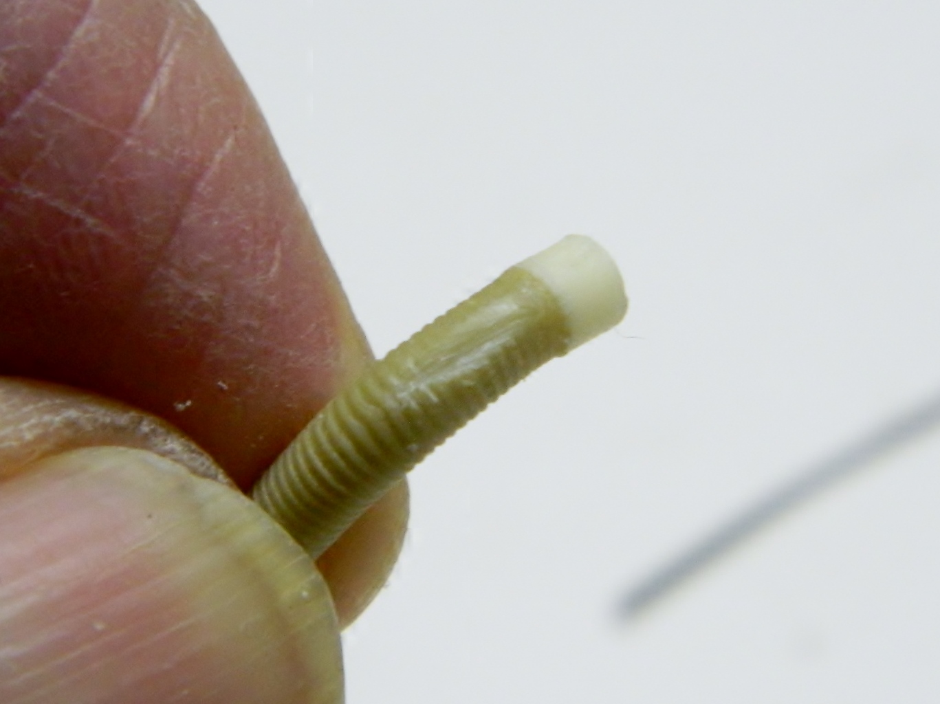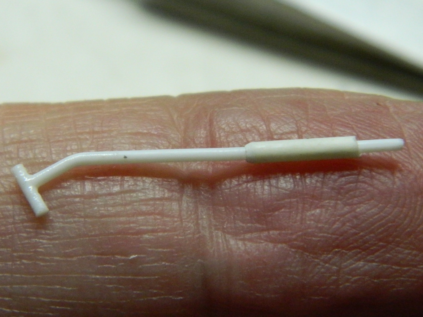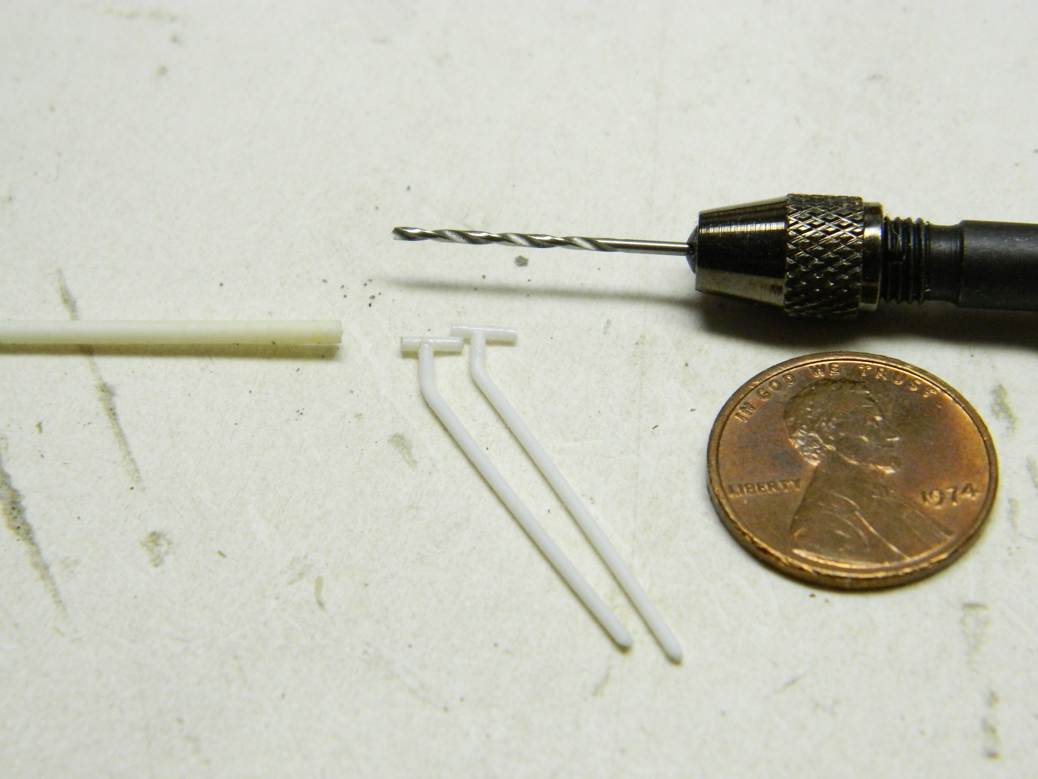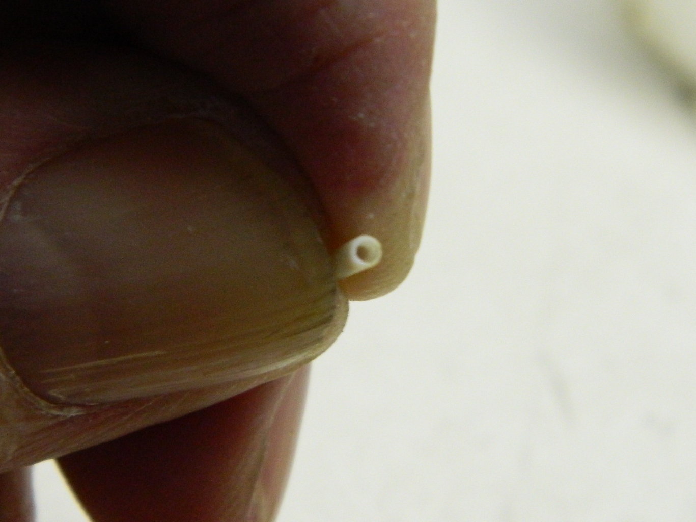 Things would be much easier if that’s all they needed but such is not the case. The front end of the manifolds are of a larger diameter and there’s a taper that joins the two. I took .068″ (1.727mm) styrene rod, drilled out the center to make a sleeve, tapered one end of it, and slid it over the .038″ (.965mm) sections: