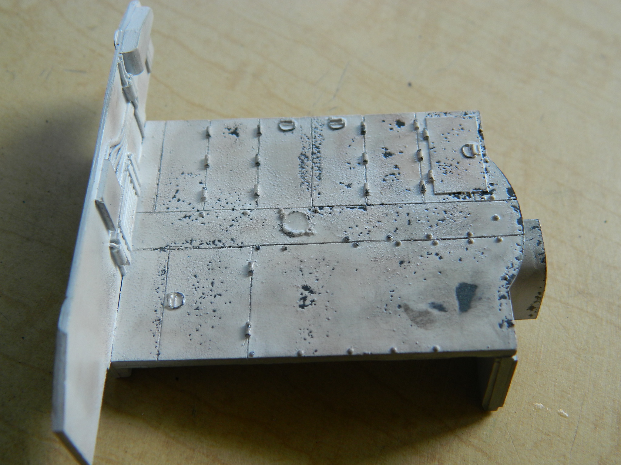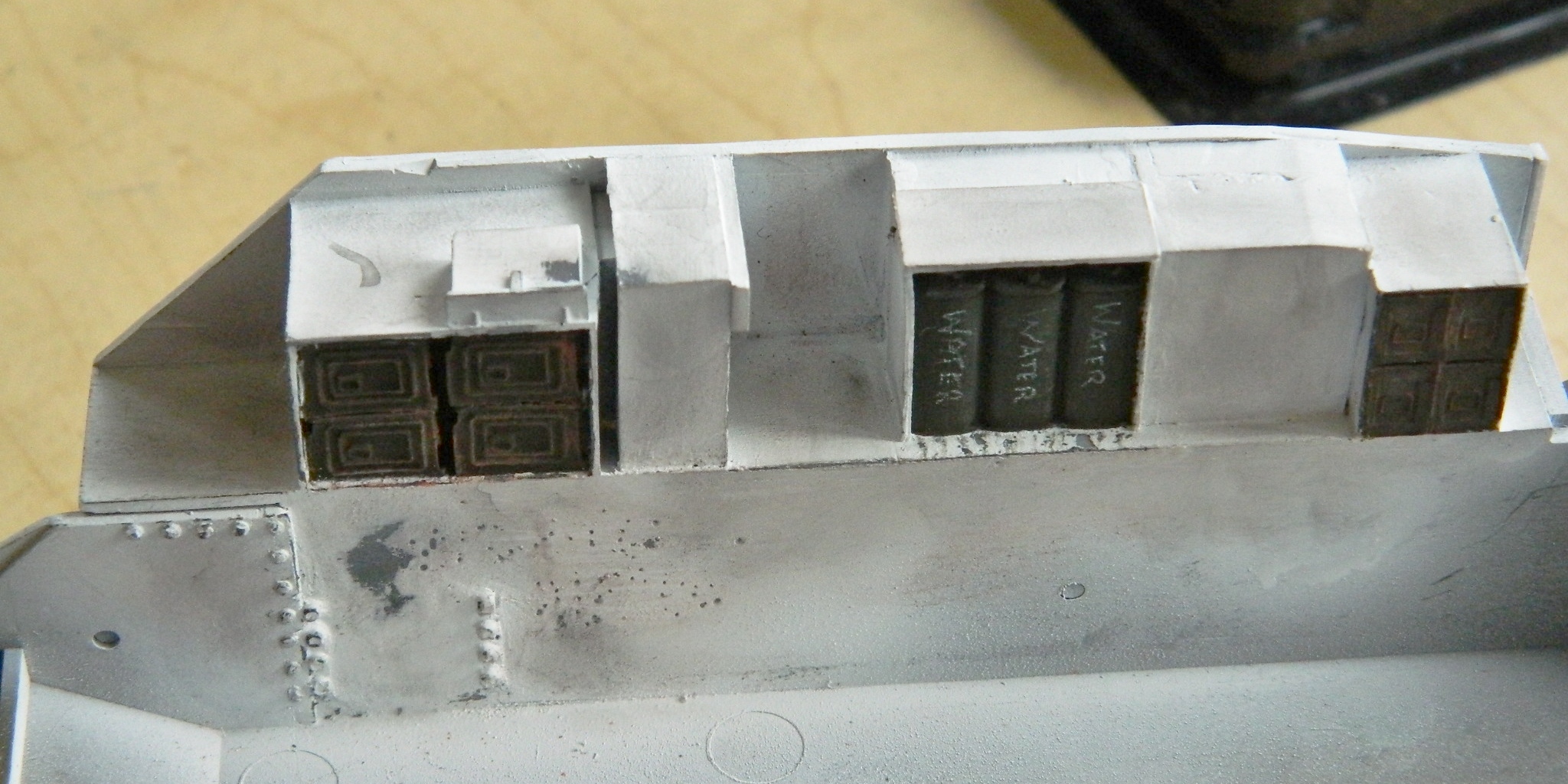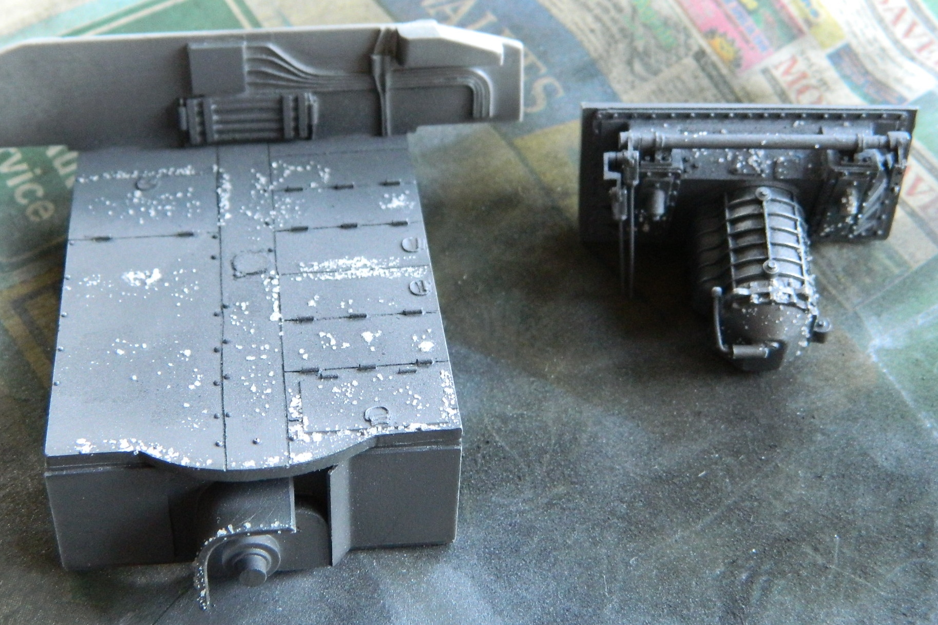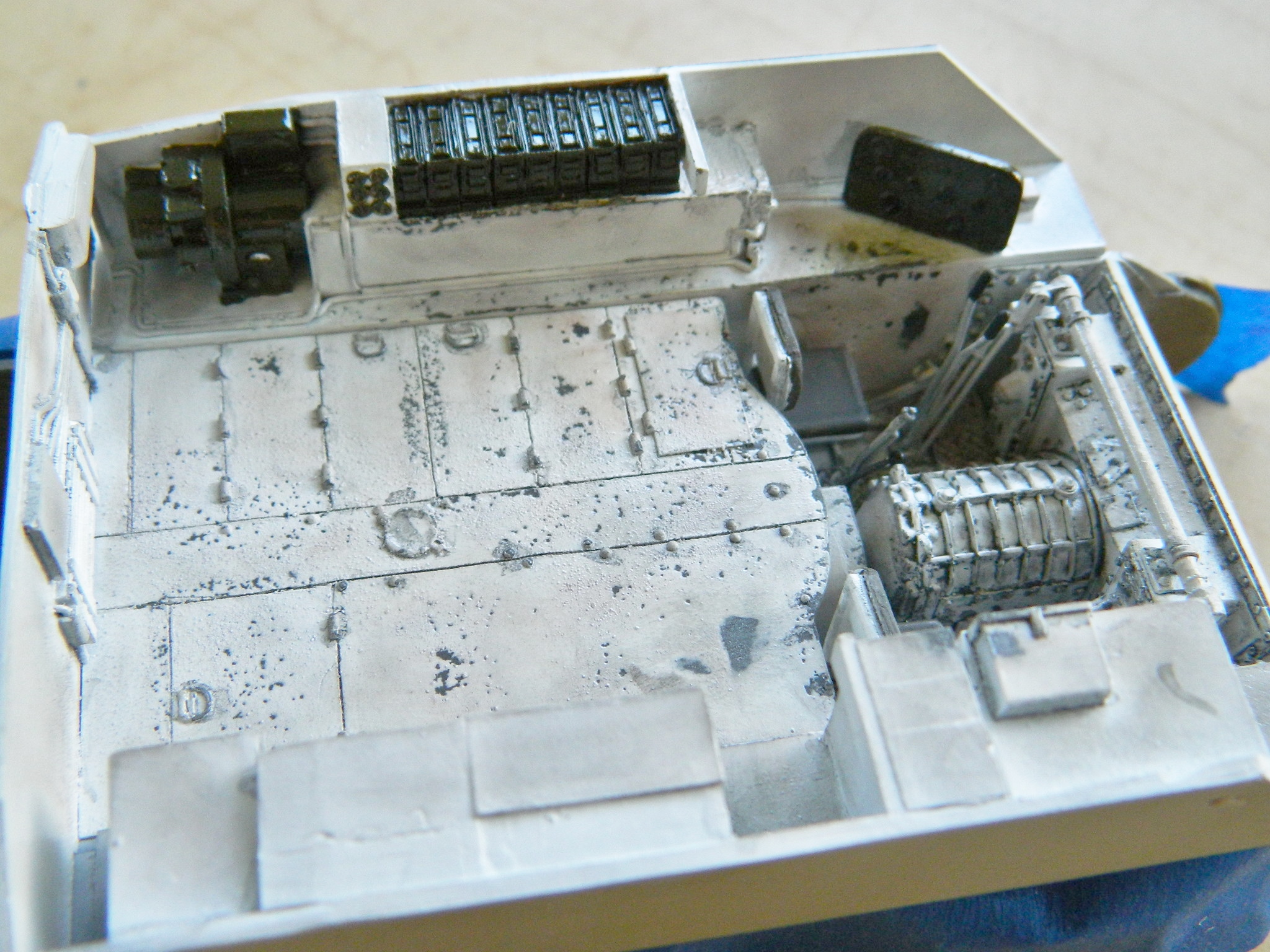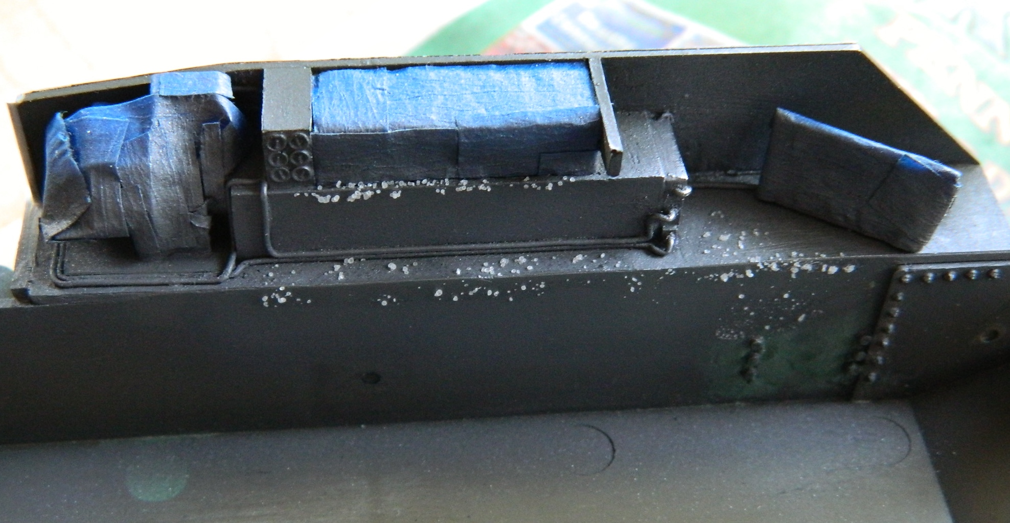 The next step is to salt chip the interior parts. My earlier painting experiment with the unused kit showed me that the salt chipping technique could work well, but I wanted smaller chips as they would be put there by the crew, their hardware, and moving around ammo cans, etc. To accomplish that, I took table salt and ground them a bit between two spoons. Too large and the chips would look “off,” too small and the chips would dissolve in water! And then there’s the skull-sweat required to put the chips where using the equipment and machine would result in chipping. I added the sponson details at this time so that I could make the wear of them and the lower hull sides integrated: