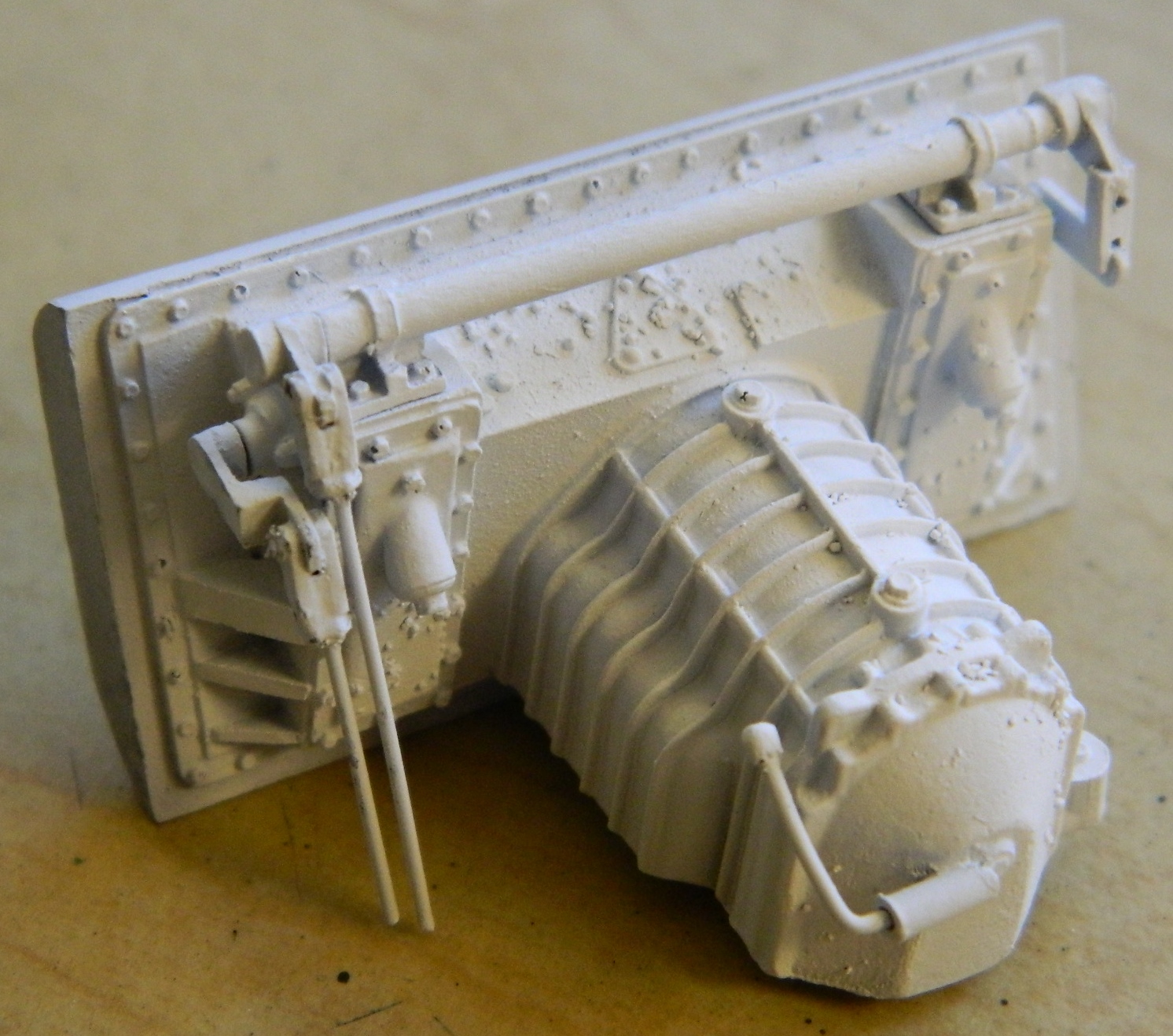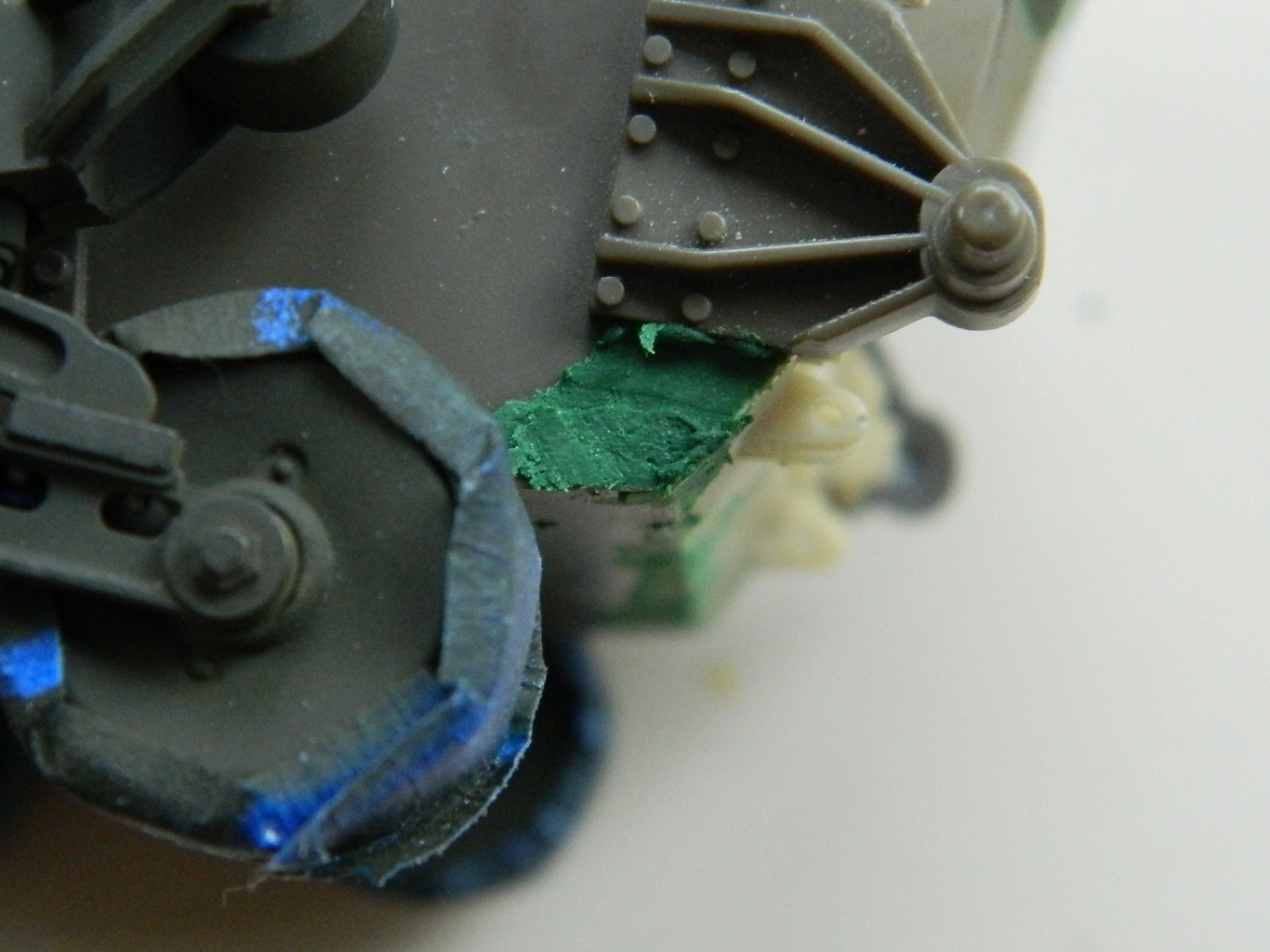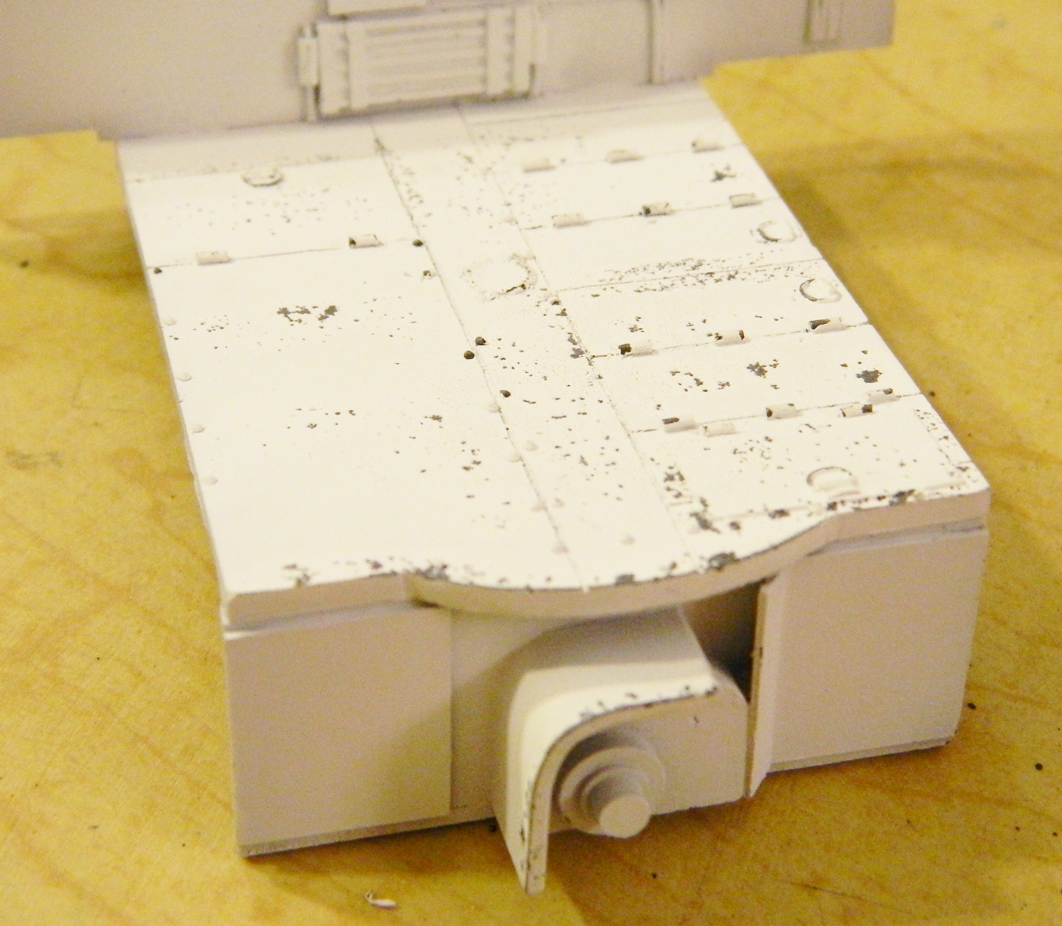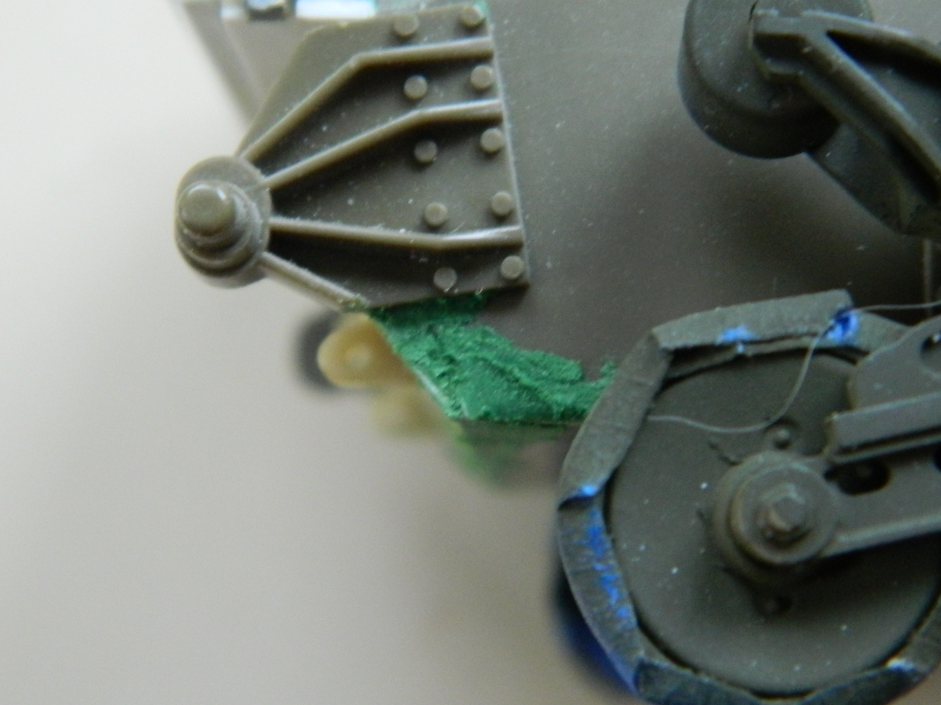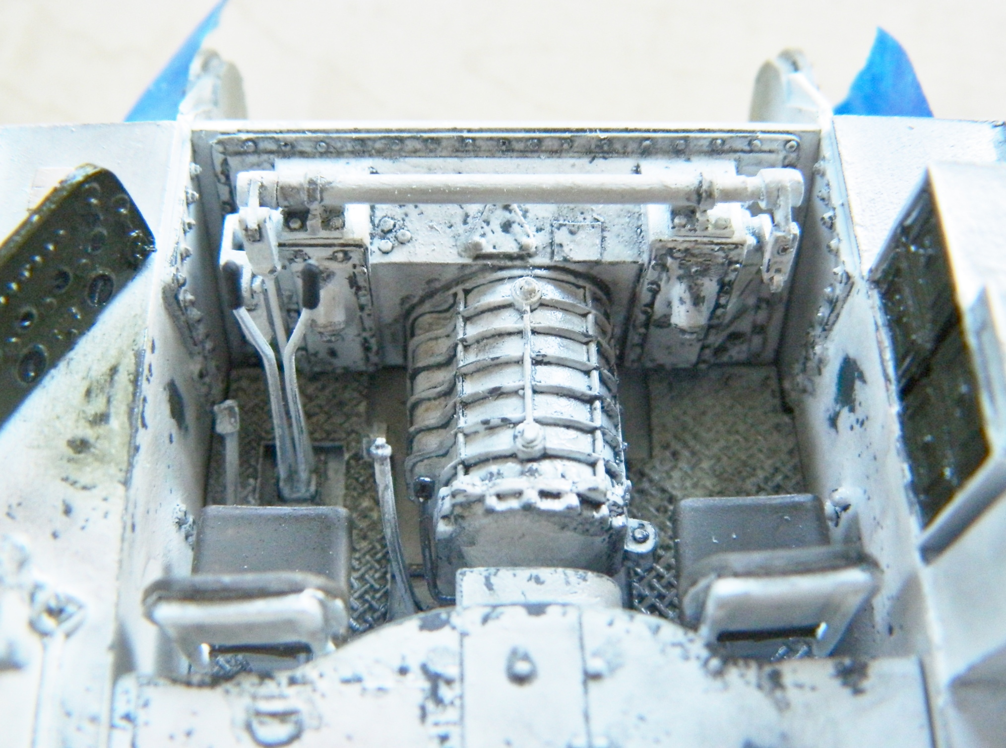 The next step is to salt chip the interior parts. My earlier painting experiment with the unused kit showed me that the salt chipping technique could work well, but I wanted smaller chips as they would be put there by the crew, their hardware, and moving around ammo cans, etc. To accomplish that, I took table salt and ground them a bit between two spoons. Too large and the chips would look “off,” too small and the chips would dissolve in water! And then there’s the skull-sweat required to put the chips where using the equipment and machine would result in chipping. I added the sponson details at this time so that I could make the wear of them and the lower hull sides integrated: