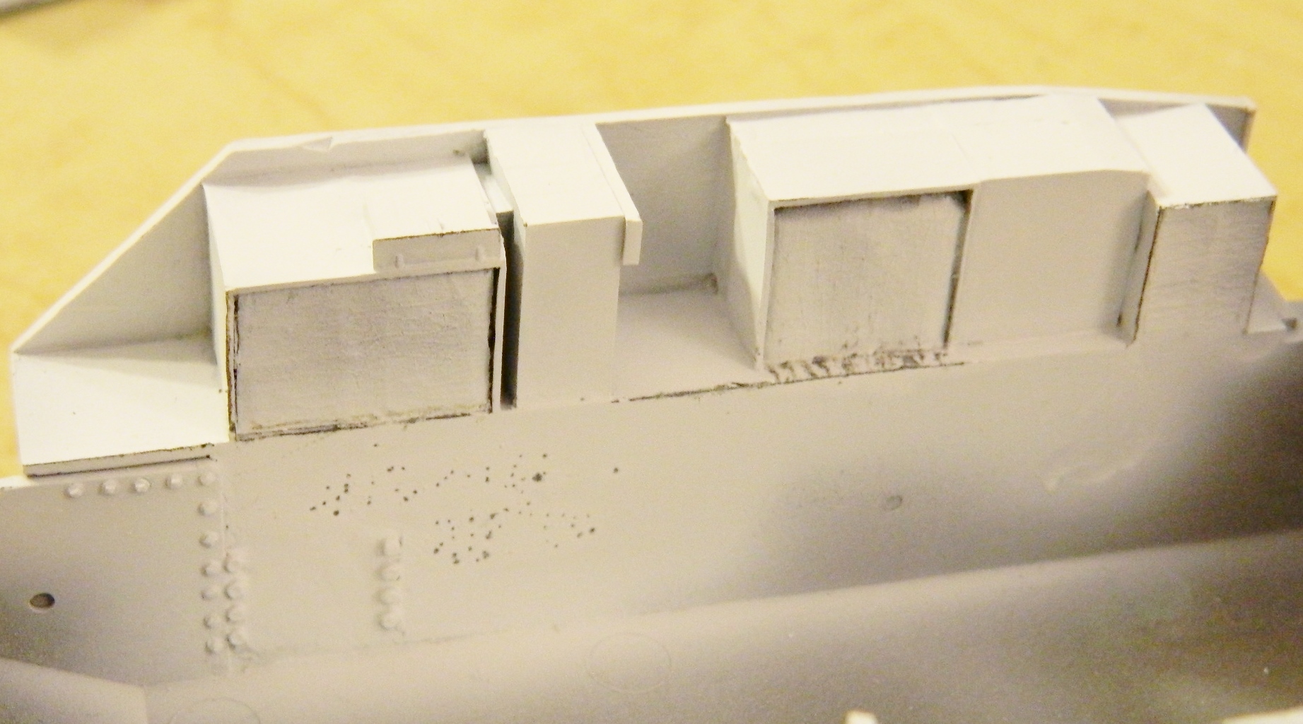 Once the superglue had set up, I applied putty to those areas of the rear bulkhead and hull joins to fill gaps: