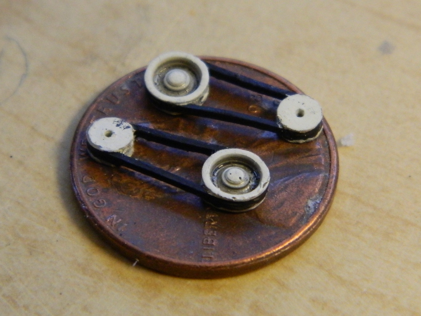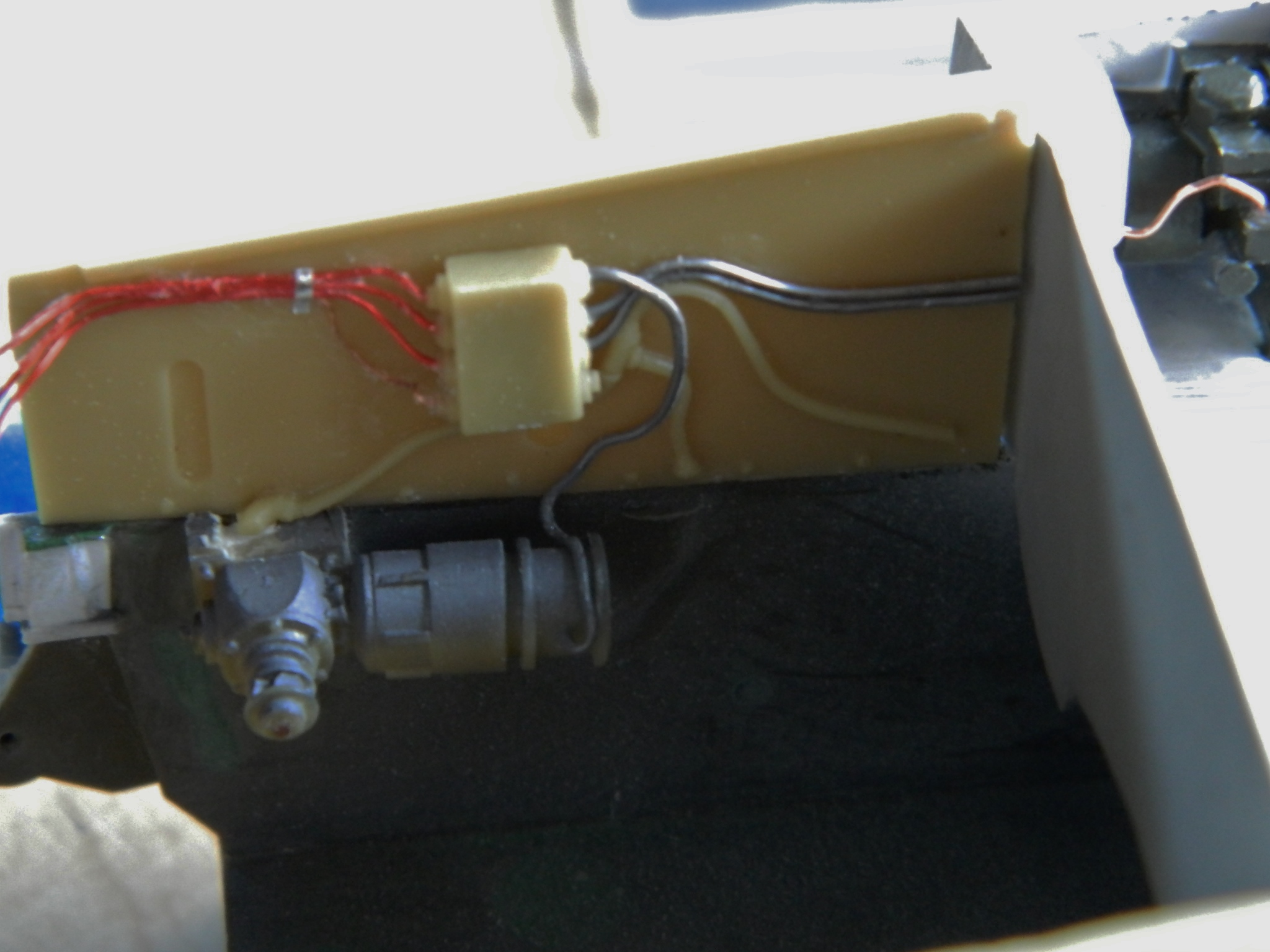 I spent a fair amount of time trying to figure out why it wouldn’t sit in there straight and couldn’t find the problem. I gave up the next day and glued the FREAKING INTERCOURSING SODDING thing in. Once I had, I added the hoses to each end of the coolant manifolds. The hoses connecting the manifolds to the radiators were made from solder and painted rubber black, the hoses connecting the manifolds to the fill reservoir are actually rubber. Well, actually polyolefin; I heated some shrink tubing, stretched it to the size I wanted while it was still hot, and glued them all into place:
