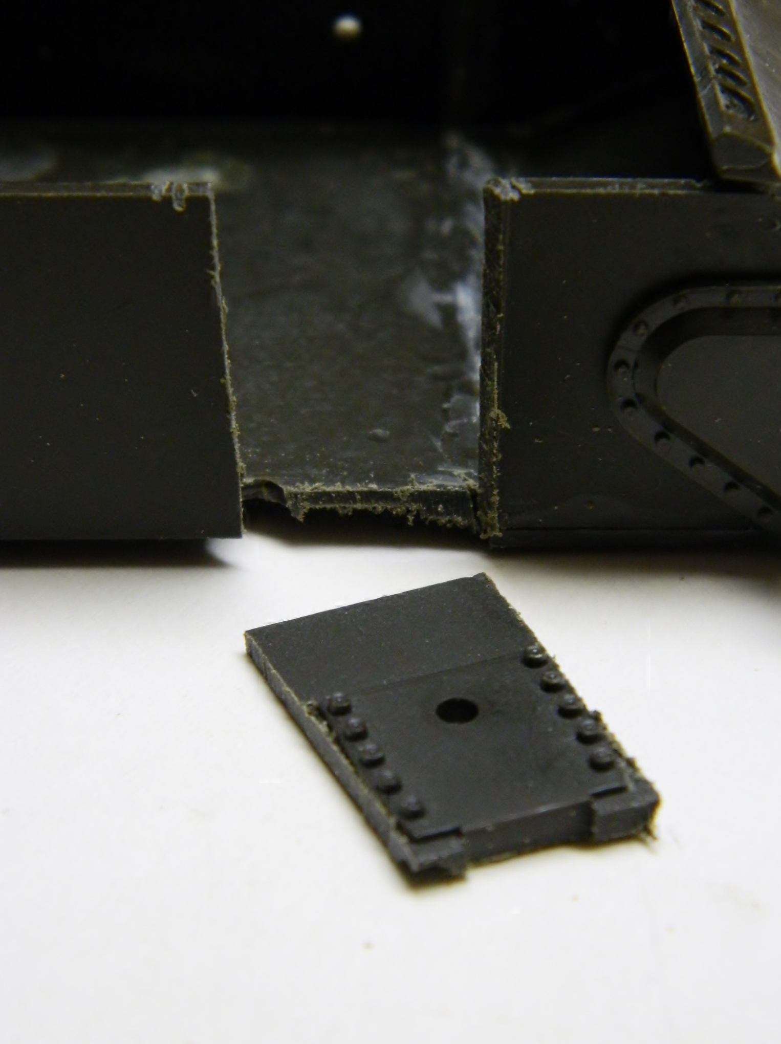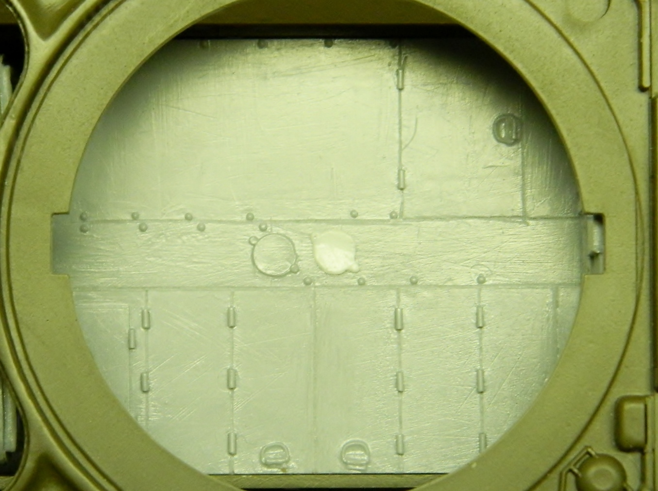 Dry-fitting, showed another inaccuracy. On the gray, inner, part seen through the large hole (that’s where the turret will sit) there is a round part in the center and off to the left. That’s supposed to be centered under the turret so I’m going to have to move that: