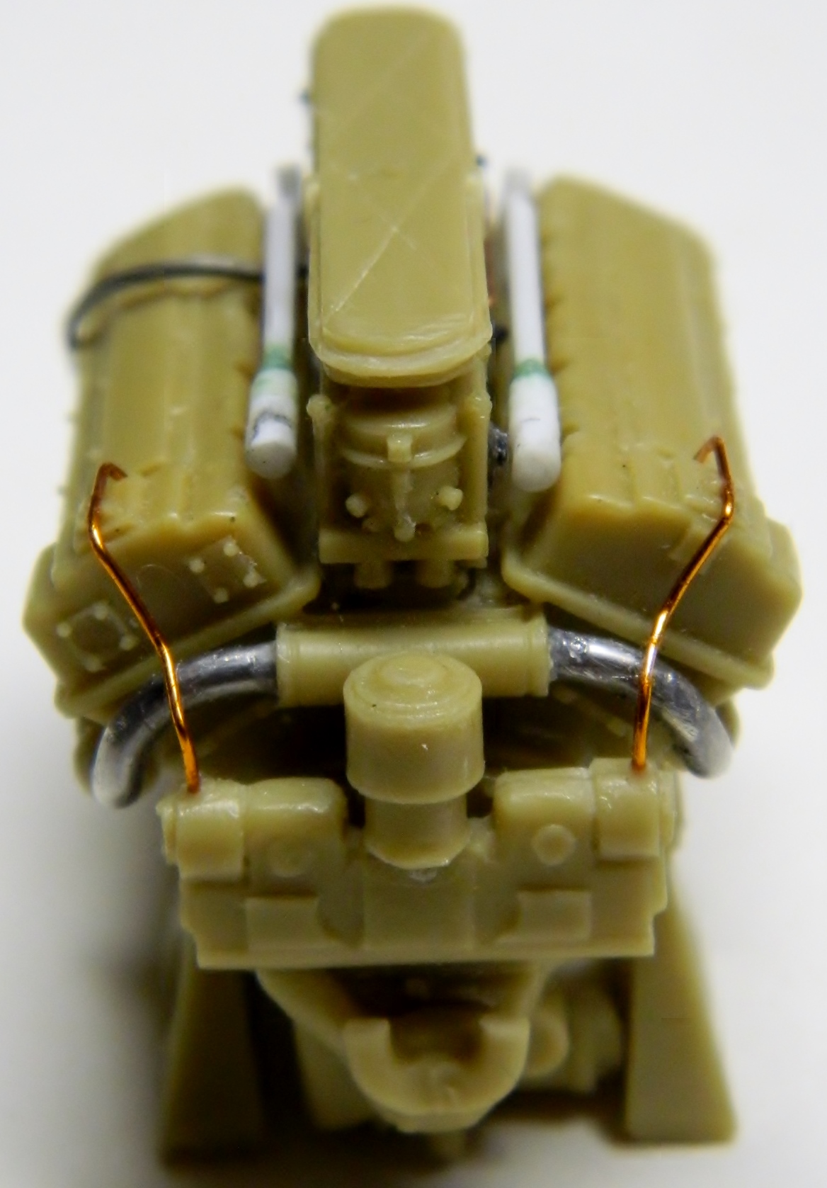 Because there’s only so much of really tiny things that these old eyes will abide at any one sitting (yeah, because those parts are ever so much larger), I went back to the engine and added the throttle linkage that goes to the driver (silver line), the ignition harnesses (copper lines) and the coolant manifolds: