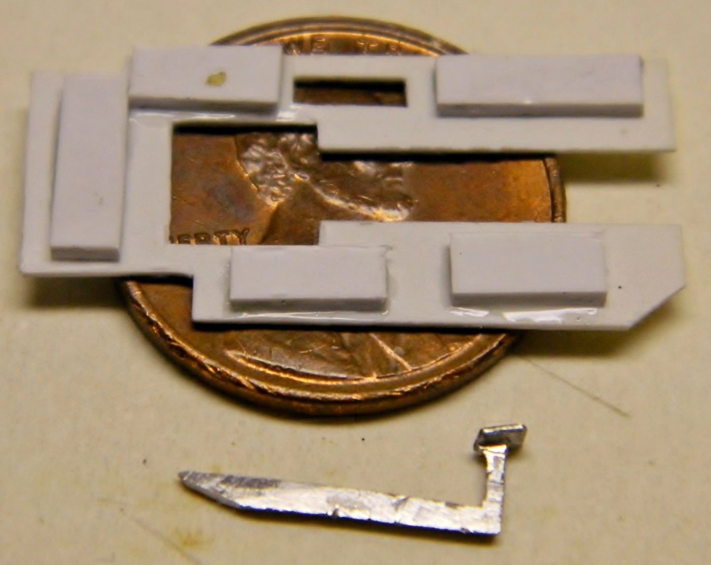 Then I filled it with homemade structural putty that I concocted by dissolving styrene scraps in liquid model cement. The cement works by dissolving the pieces of styrene and once dissolved, the scraps made a gooey plastic that is stronger than commercial filler putty for when strength matters (the goo isn’t as dense as the styrene kit parts but is substantially denser than putty). I used that structural putty to fill the impression in the aluminum (if you’re unwilling to wait overnight for the glue in this solution to evaporate out, you can take THIN shavings of styrene, overfill the depression, and hold the plastic-filled aluminum over a candle, moving it closer until the plastic starts to melt; you’ll have to fiddle with the distance to the flame so the plastic doesn’t get hot enough to char or ignite) (don’t ask how I know this):